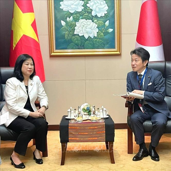 Bộ trưởng Đào Hồng Lan họp song phương cùng Thứ trưởng Bộ Y tế, Lao động, Phúc lợi Nhật Bản Hamachi Masakazu. Ảnh: TTXVN phát |