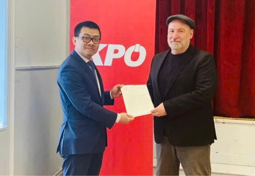 Đại sứ Vũ Lê Thái Hoàng trao Thư cảm ơn của Ban chấp hành Trung ương Đảng Cộng sản Việt Nam tới tay đồng chí Günther Hopfgartner Chủ tịch KPÖ. Ảnh: nhandan.vn |