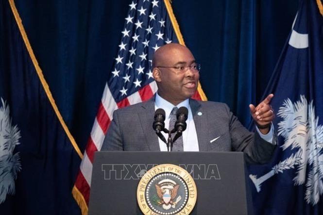 hủ tịch Ủy ban Toàn quốc đảng Dân chủ Mỹ (DNC) Jaime Harrison phát biểu tại Columbia, South Carolina, Mỹ, ngày 27/1/2024.
