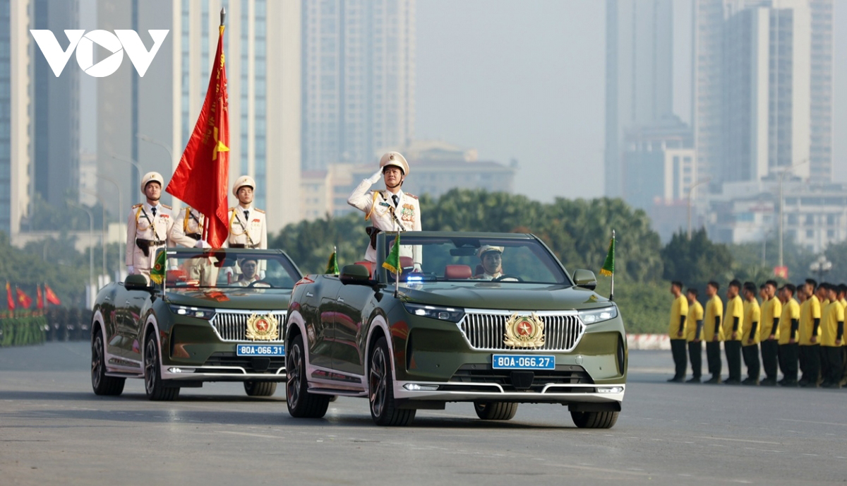 Xe chỉ huy và Tổ Công an kỳ dẫn đầu đội hình đại diện cho các lực lượng tham gia bảo vệ Đại hội Đảng toàn quốc lần thứ XIV. Ảnh: Trọng Phú/vov.vn