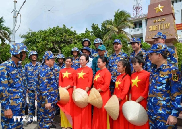 Tư lệnh Hải quân, Trần Thanh Nghiêm (thứ 3, từ trái) và đại biểu đoàn công tác thăm hỏi, động viên quân và dân đảo Song Tử Tây. Ảnh: TTXVN |