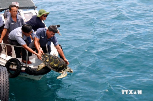 Cá thể đồi mồi (có tên khoa học là Eretmochelys imbricata) được thả về biển. Ảnh: Nguyễn Thanh/TTXVN