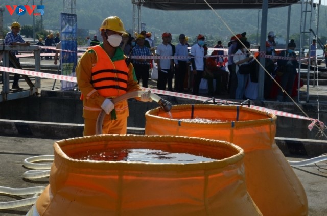 Tình huống giả định, tàu có trọng tải 3.000 tấn chở nhựa đường đang cập cầu cảng chuyên dùng Thọ Quang, mạn trái của tàu đâm va vào cầu cảng làm rách vỏ tàu, bục thủng khoang chứa nhiên liệu, tàu bị nghiêng và có nguy cơ chìm tàu. Thời điểm xảy ra sự cố, trên tàu còn khoảng 40m3 dầu DO, lượng dầu tràn ra biển khoảng 20m3, nguy cơ xảy ra cháy, nổ tại khu vực xảy ra sự cố. Tàu của Bộ Chỉ huy Bộ đội Biên phòng đã tiếp cận tàu bị nạn và đưa 3 người lên tàu, tiến hành sơ cứu và đưa vào bờ để lực lượng y tế đưa đi cấp cứu. Sau 30 phút khẩn trương xử lý, sự cố đã được khắc phục, thu gom toàn bộ lượng dầu tràn bảo đảm đúng kỹ thuật và vận chuyển đi xử lý đúng nơi quy định.
