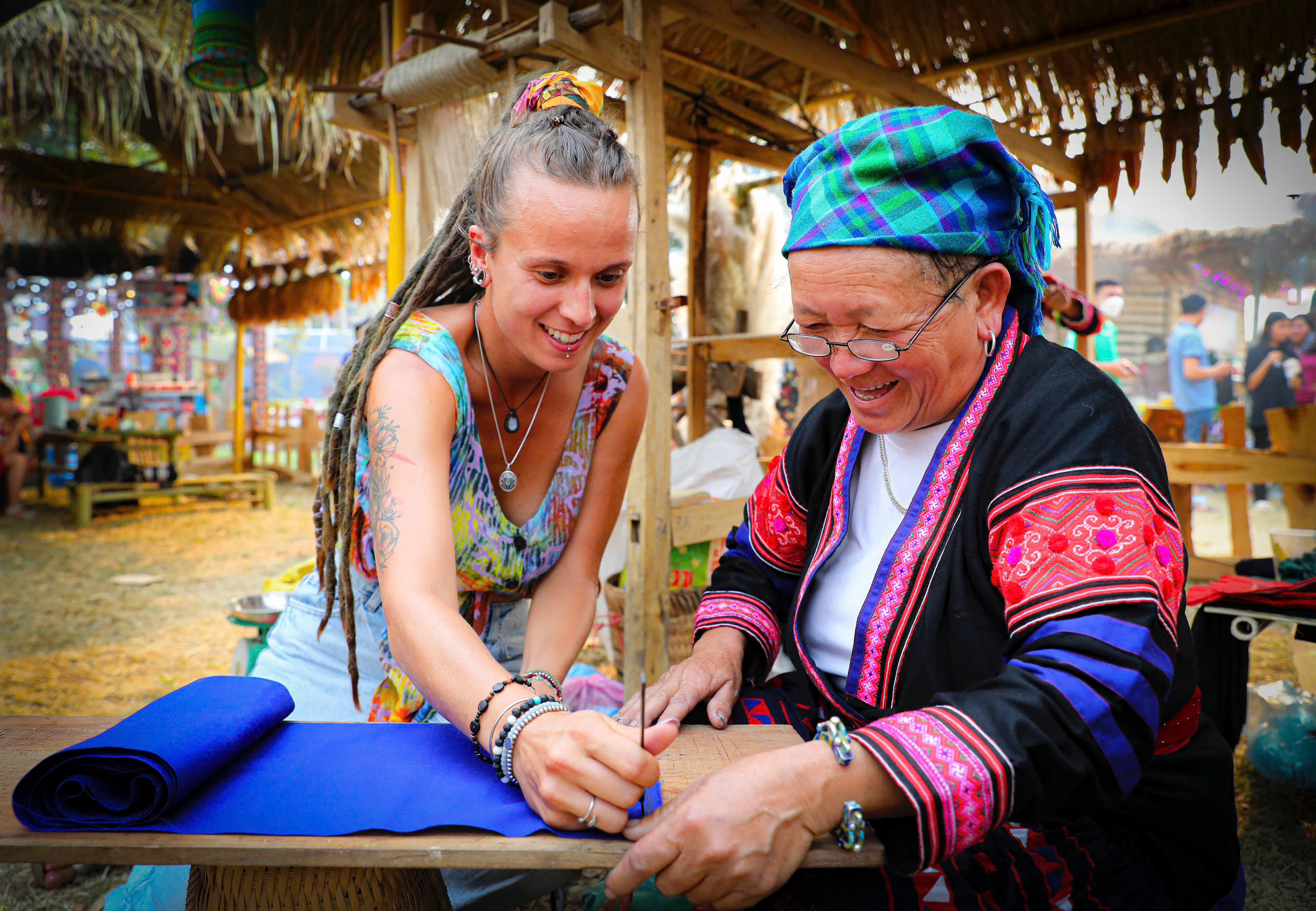 Du khách trải nghiệm tại Không gian Văn hoá vùng cao trong Lễ Hội Hoa Ban.