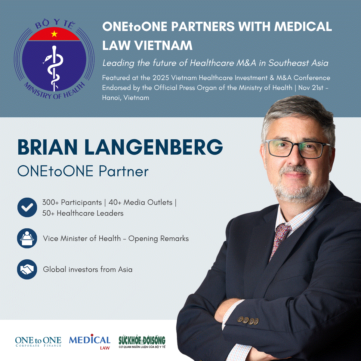 Và chúng tôi là một trong số đó. Tập đoàn One to One của Mỹ đang tạo thành một quan hệ hợp tác chiến lược với Việt Nam trong lĩnh vực y tế. Như với Medicallaw, chúng tôi tìm hiểu và nhanh chóng nhận ra rằng họ là những chuyên gia hàng đầu về khung pháp lý – quy định trong ngành y tế mà bất kỳ nhà đầu tư nào muốn ra quyết định đều cần. Còn chúng tôi mang đến kinh nghiệm tư vấn tài chính xuyên biên giới, với mạng lưới đối tác trên 30 quốc gia trên mọi châu lục. Chúng tôi cũng muốn mang góc tiếp cận thị trường vốn cho những doanh nghiệp Việt có ý định niêm yết cổ phiếu hoặc trái phiếu. Mục tiêu là giúp tất cả người tham dự hiểu rõ hơn cơ hội, cấu trúc, thực tiễn tốt nhất, và thúc đẩy các cuộc đối thoại dẫn đến hợp tác.