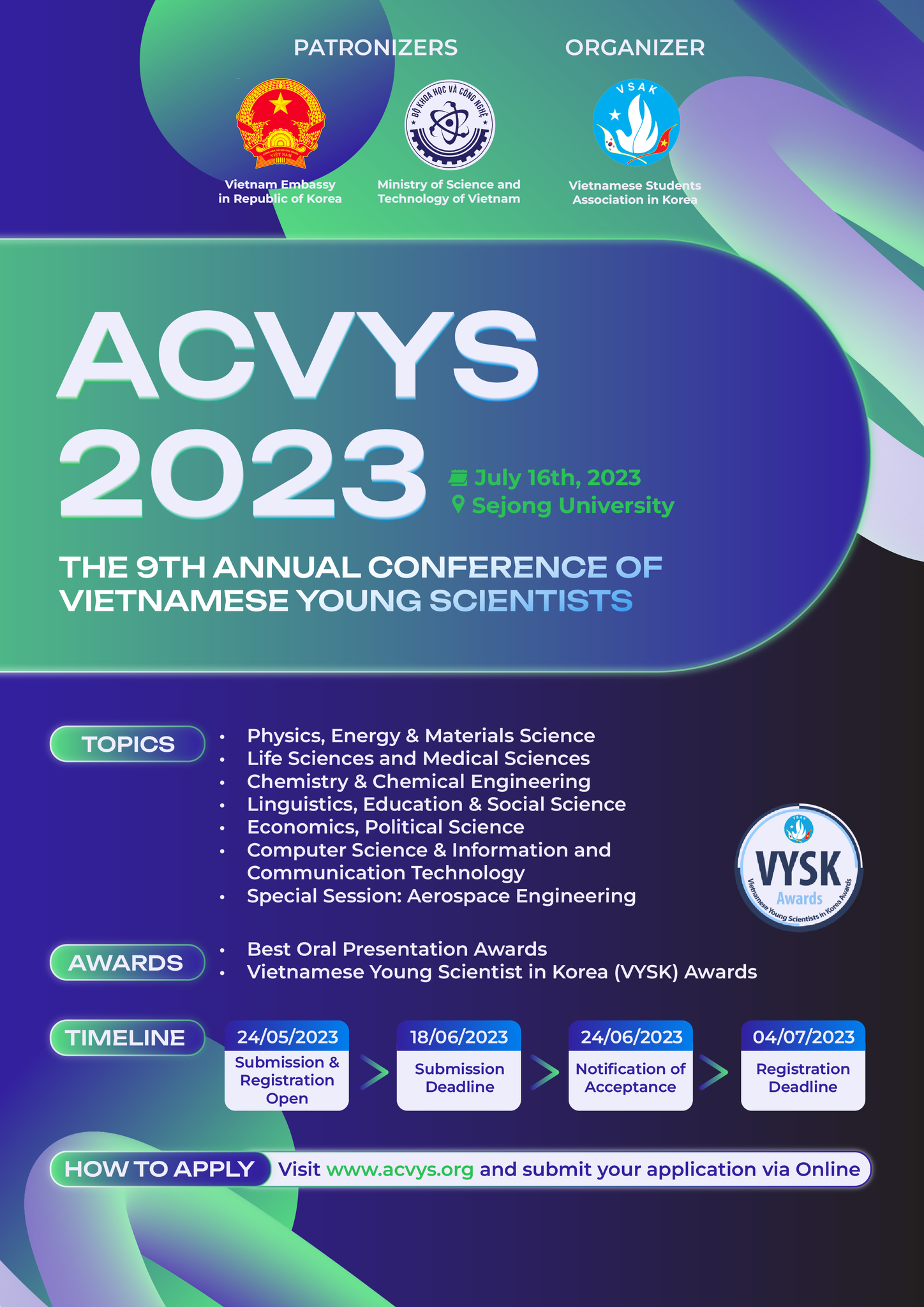 Ngày 16/7 tới, Hội sinh viên Việt Nam tại Hàn Quốc sẽ tổ chức Hội thảo các nhà khoa học trẻ Việt Nam tại Hàn Quốc (ACVYS) lần thứ 9, năm 2023 tại trường Đại học Sejong, thủ đô Seoul, Hàn Quốc. Điểm nhấn của hội thảo là tọa đàm với chủ đề “Du học sinh Việt Nam tại Hàn Quốc: nắm bắt cơ hội, vươn tới tương lai”.