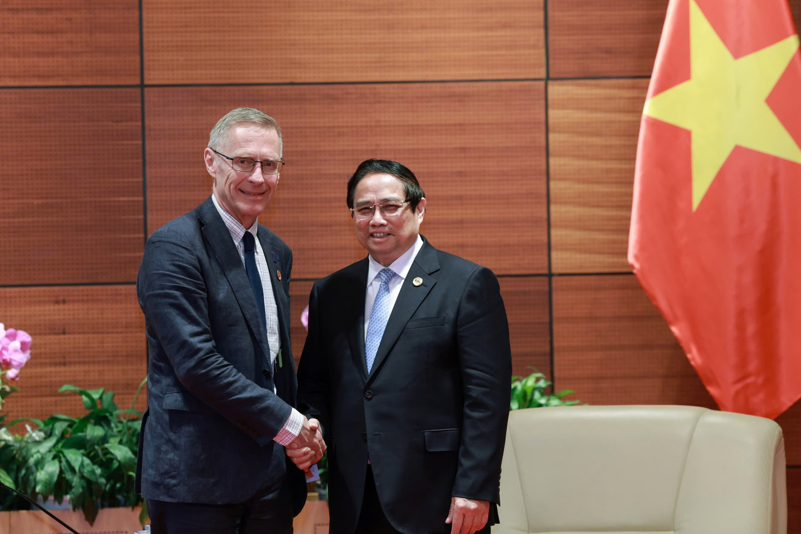 Thủ tướng Phạm Minh Chính có buổi tiếp ông Donal Brown nhân dịp Ông tham dự Hội nghị Thượng đỉnh Đối tác Tăng trưởng Xanh và Mục tiêu Toàn cầu 2030 (P4G) tại Hà Nội từ 14-17/4/2025. Ảnh IFAD Việt Nam cung cấp |