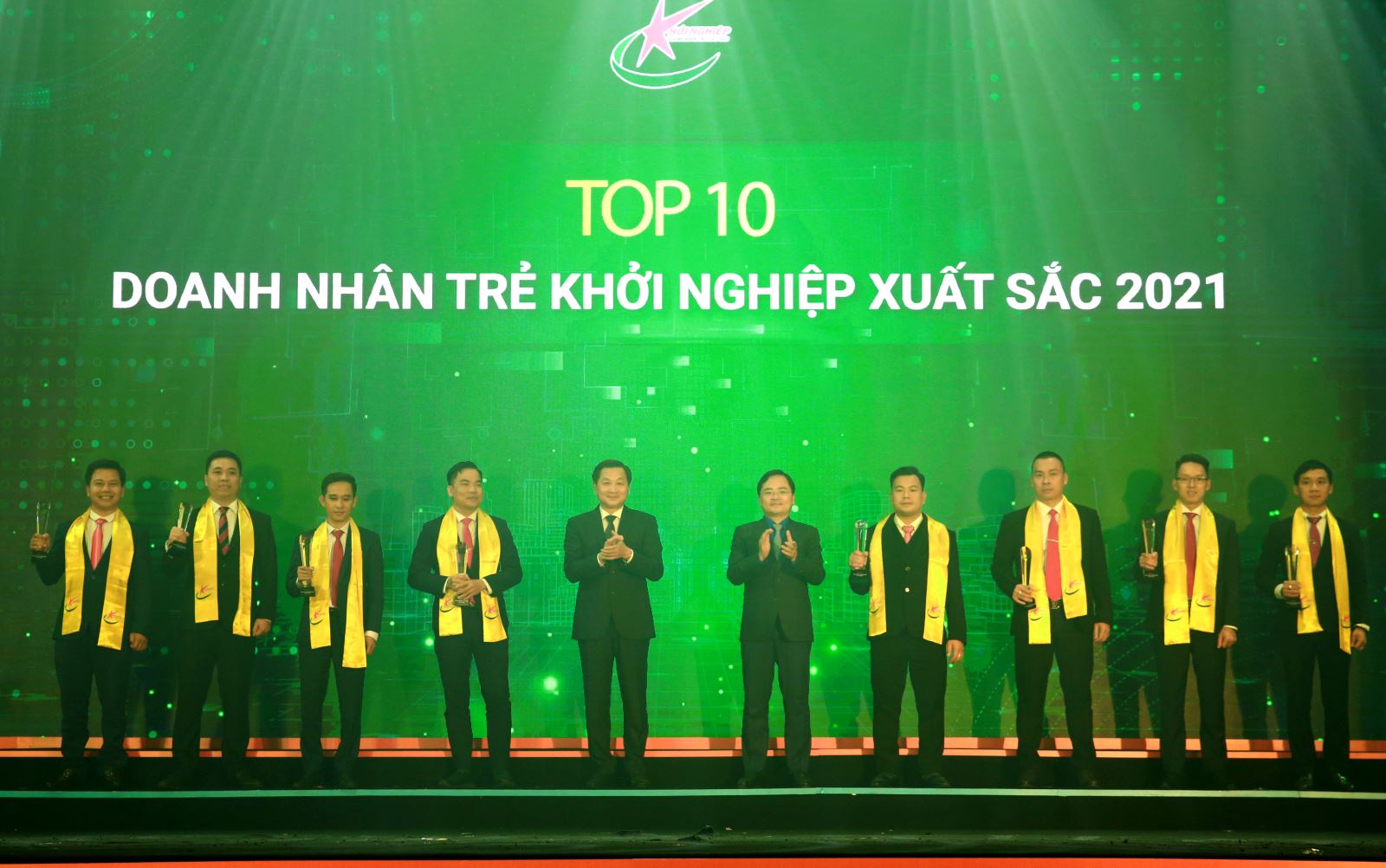 Phó Thủ tướng Lê Minh Khái và Bí thư Thứ nhất Trung ương Đoàn Nguyễn Anh Tuấn trao danh hiệu TOP 10 “Doanh nhân trẻ khởi nghiệp xuất sắc 2021” - Ảnh: baochinhphu.vn |