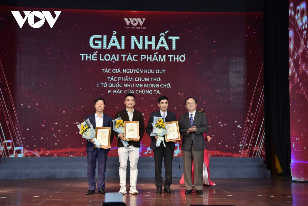 | Với tổng cộng 40 giải thưởng Hội đồng Giám khảo lựa chọn để trao cho các tác giả, giải nhất của thể loại Ca khúc đã được trao tác giả Phạm Việt Tuân với tác phẩm “Tình yêu đất nước”; Giải Nhất thể loại Dân ca đặt lời mới thuộc về soạn giả Dương Đức Nghiêm với tác phẩm “Ơn Đảng núi rừng nở hoa”, Xoè hoa DC Thái và giải nhất thể loại Thơ được trao cho tác giả Nguyễn Hữu Quý với chùm thơ “Tổ quốc như mẹ mong chờ; Bác của chúng ta”. |