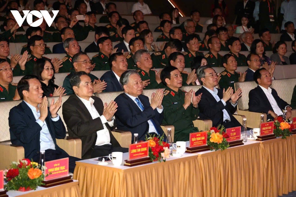 Tổng Bí thư Tô Lâm, Bí thư Quân ủy Trung ương; Chủ tịch Quốc hội Trần Thanh Mẫn cùng các lãnh đạo, nguyên lãnh đạo Đảng, Nhà nước và Ban Bí thư tham dự chương trình. Ảnh: Hà Phương/VOV |