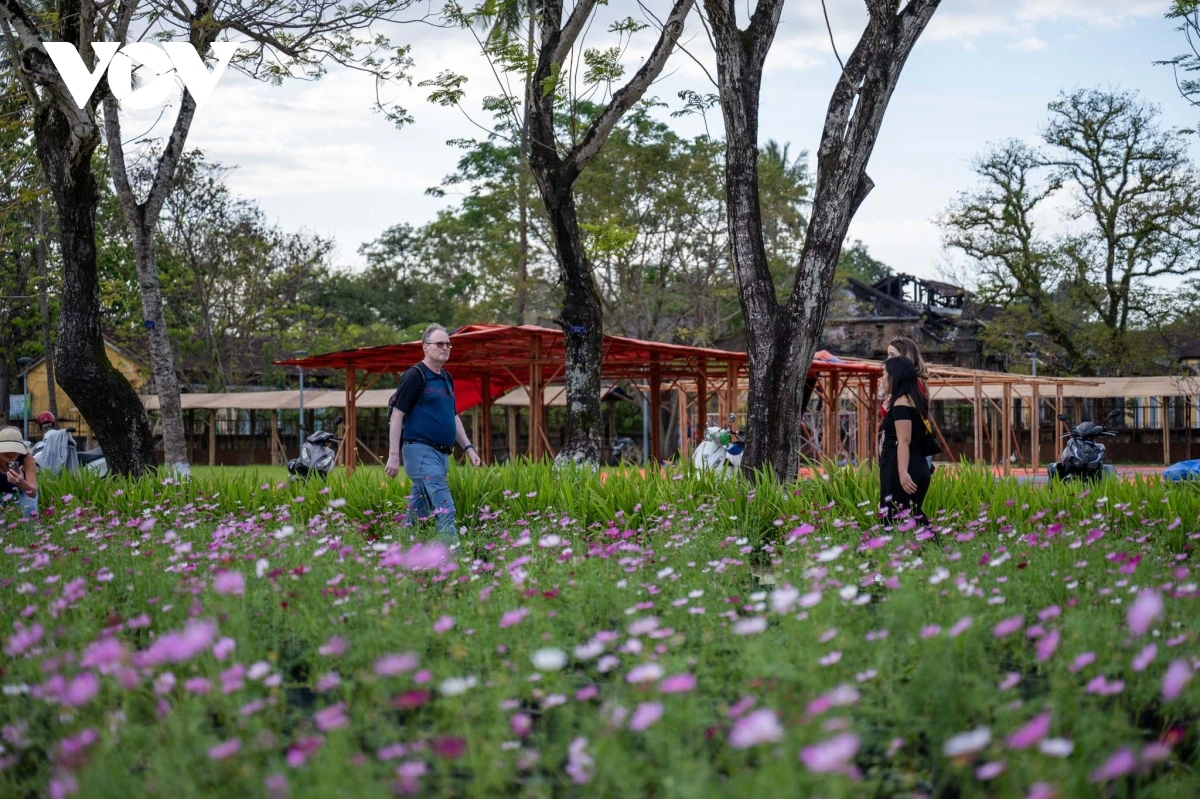 | Ban ngày, không gian ngập tràn sắc hoa tươi tắn, nổi bật trên nền trời trong xanh của Huế. Khi chiều xuống, ánh nắng xuân nhẹ nhàng phủ lên từng cánh hoa, tạo nên khung cảnh nên thơ rất “Huế”. |