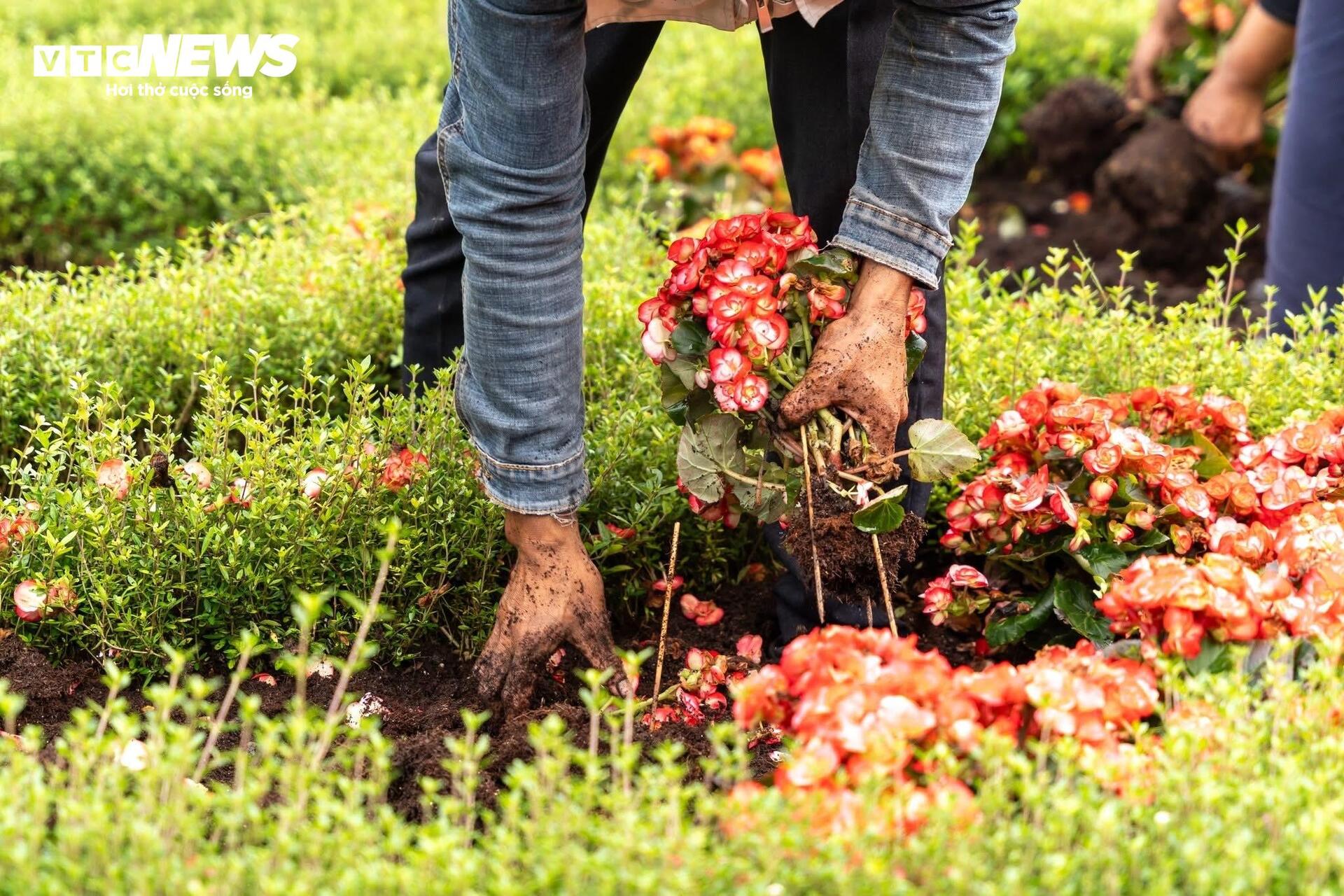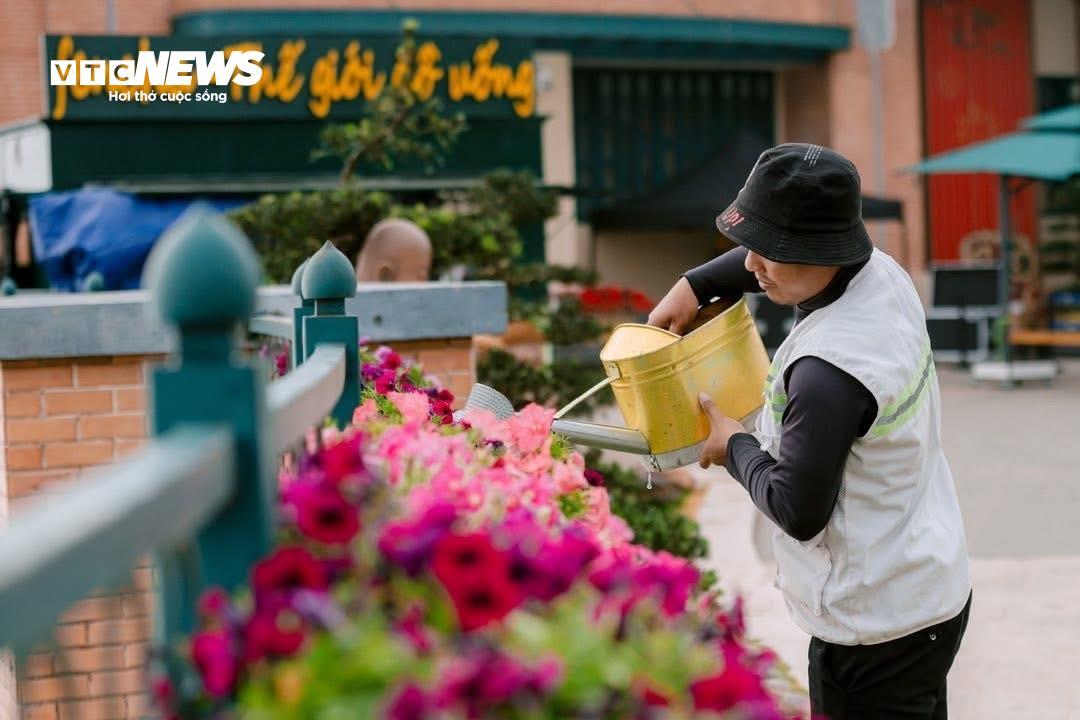 Từ sáng sớm, khi dòng khách còn chưa đông, đội ngũ nhân công đã có mặt tại vườn hoa. Người tỉa lá úa, người chỉnh lại từng khóm hoa bị nghiêng sau một đêm gió mạnh. Có người cẩn thận dùng bình tưới cầm tay bổ sung nước cho từng luống tulip, tránh làm dập cánh hoa.
