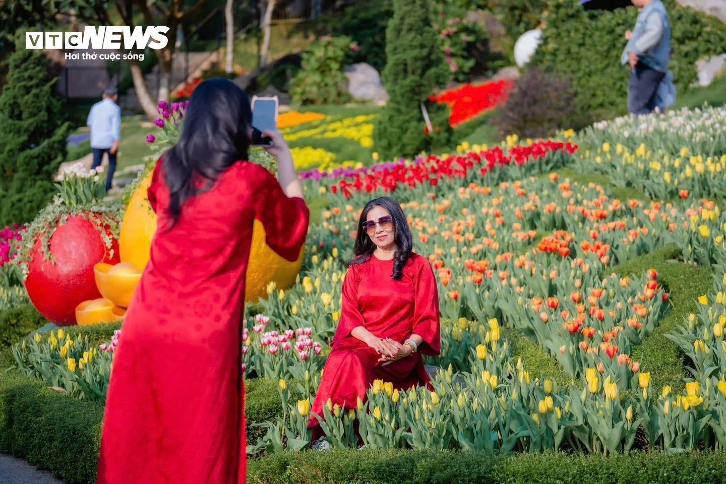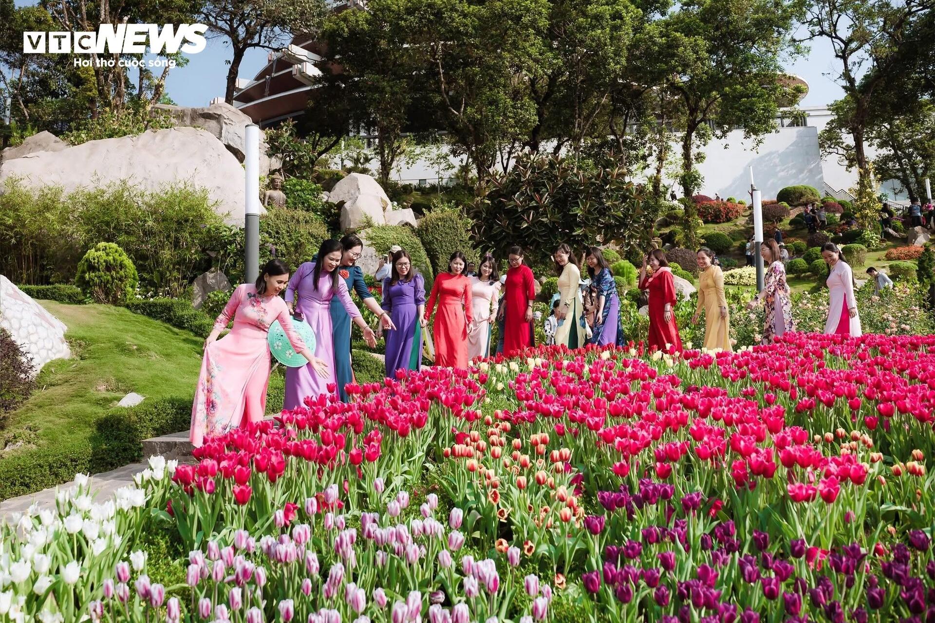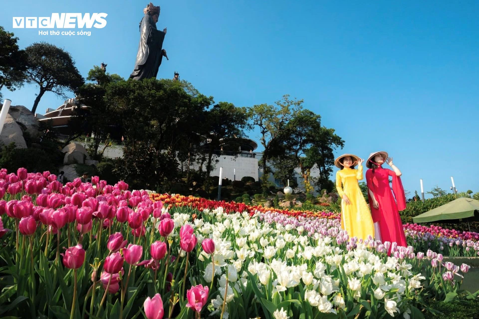 Giữa không gian núi thiêng cao hơn 900m, những luống tulip đỏ, vàng, tím, cam trải rộng tạo thành “biển hoa” nổi bật giữa nền trời xuân trong xanh. Đây là điểm check-in thu hút đông đảo du khách, đặc biệt là các gia đình và bạn trẻ.