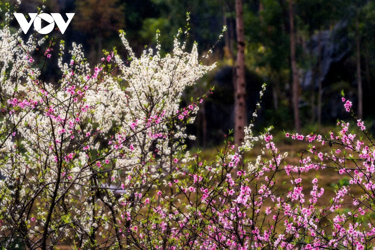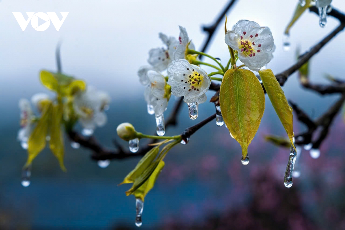 | Hoa đào phai nở thắm bên hàng rào đá, hoa mận trắng muốt tinh khôi vươn mình trong sương sớm, và cả những cành lê bọc trong lớp băng giá trong suốt. |