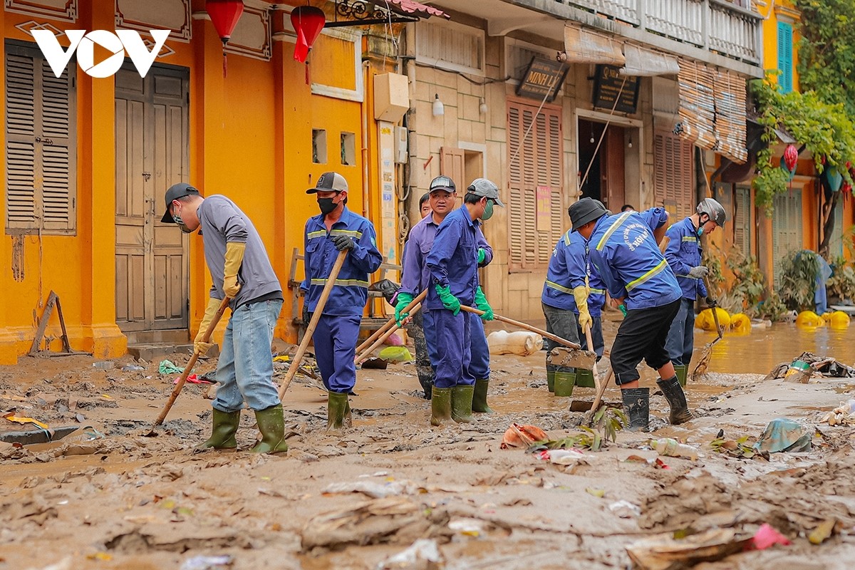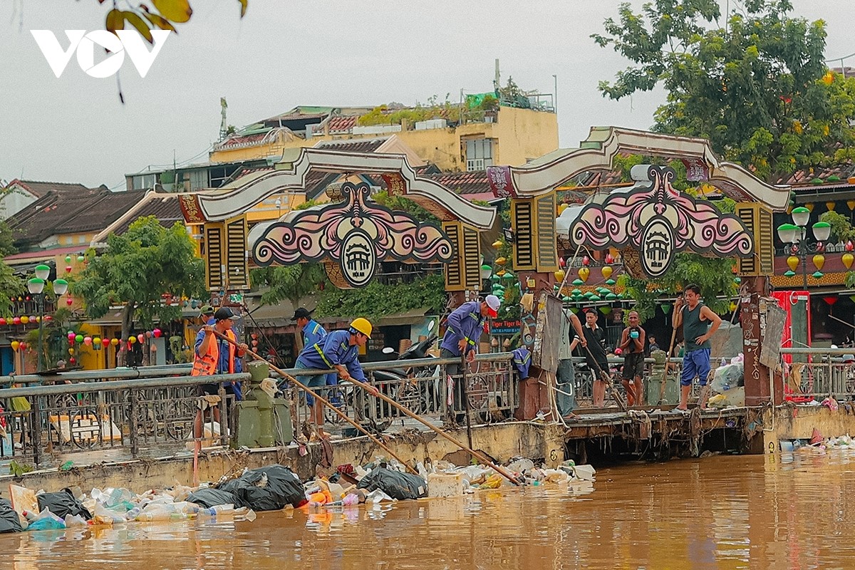 Công nhân dọn rác và bùn đường phố Hội An. |