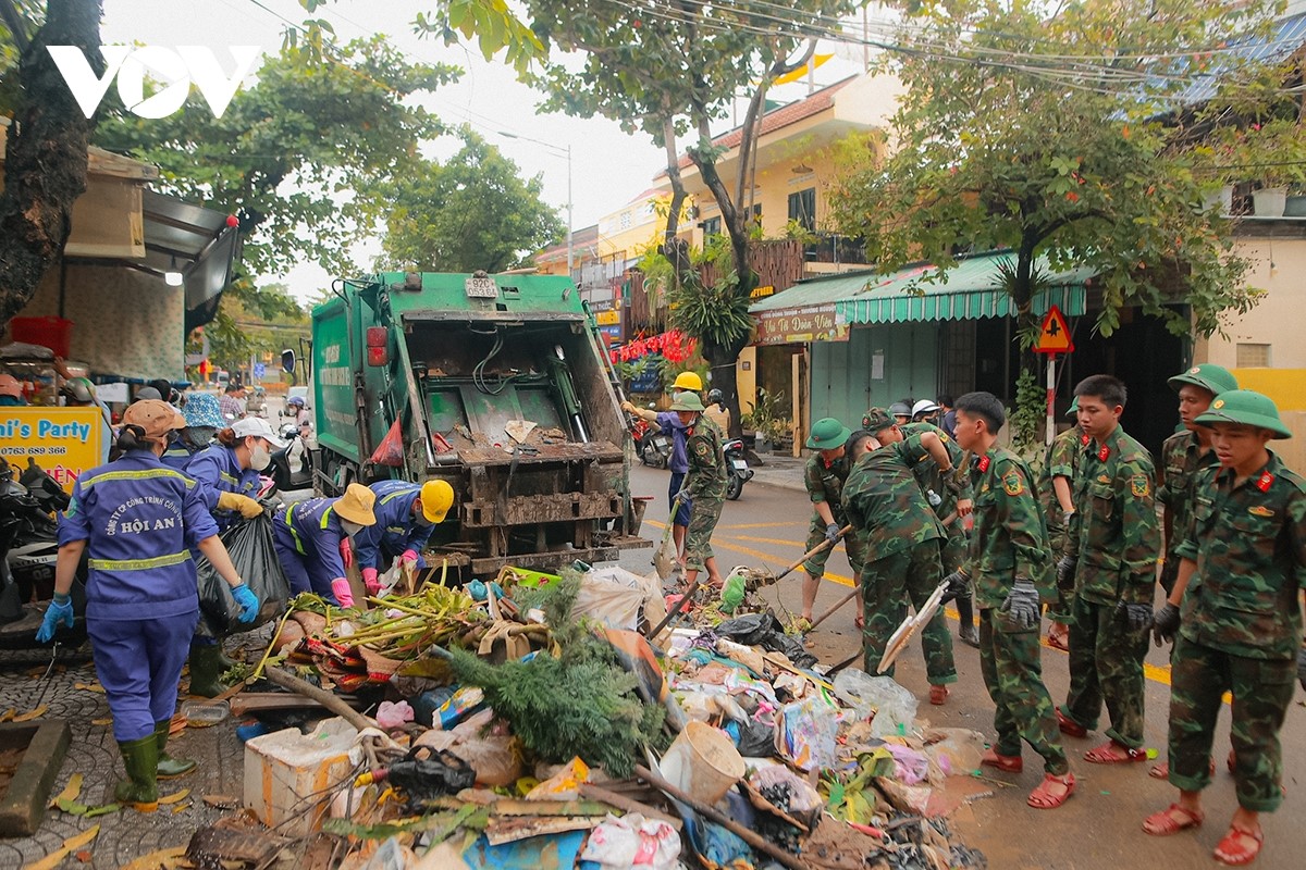 Bộ đội và công nhân vệ sinh môi trường dọn rác. |