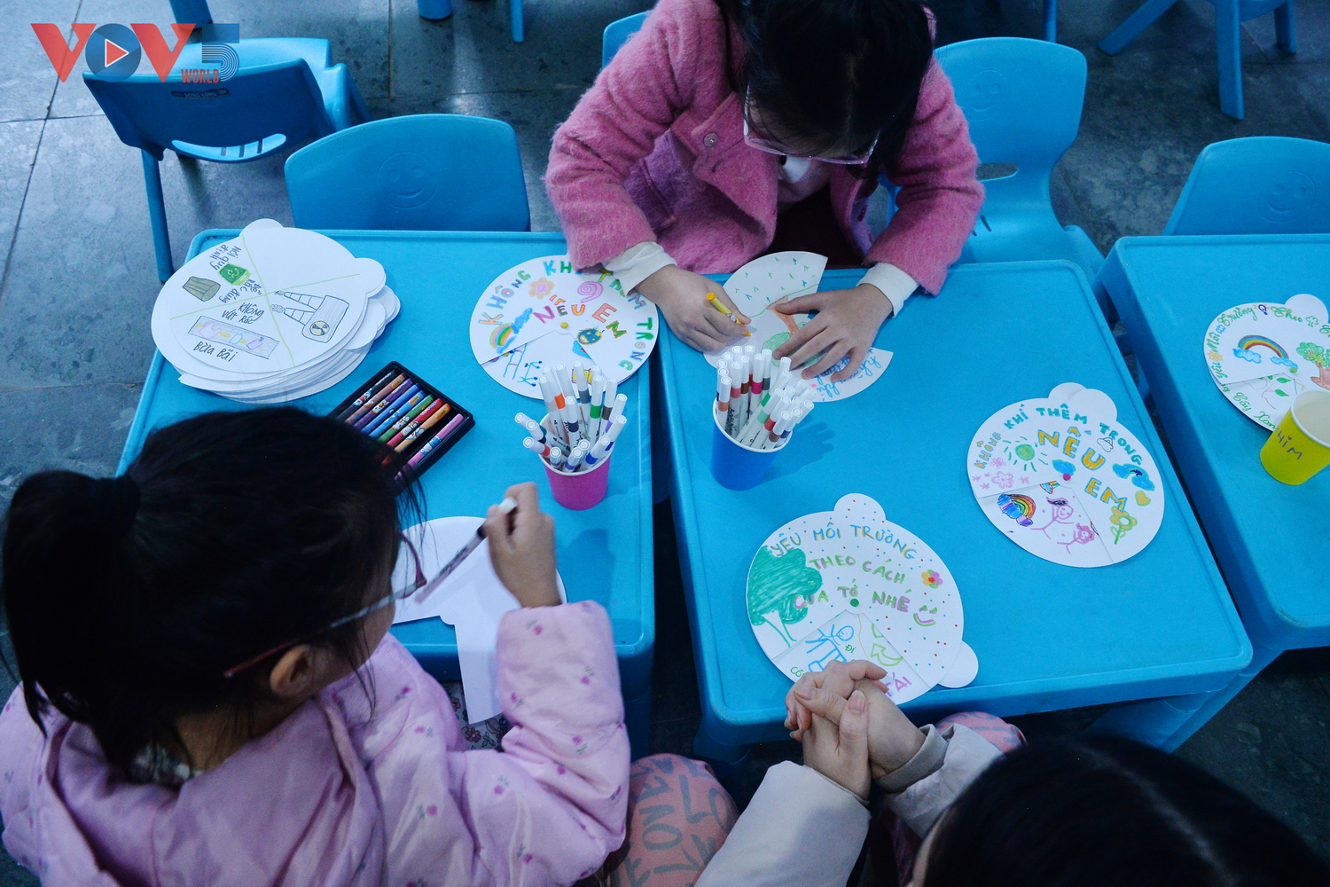 | Những em nhỏ đang tham gia thiết kế chiếc quạt bảo vệ môi trường với những thông điệp đầy màu sắc. |