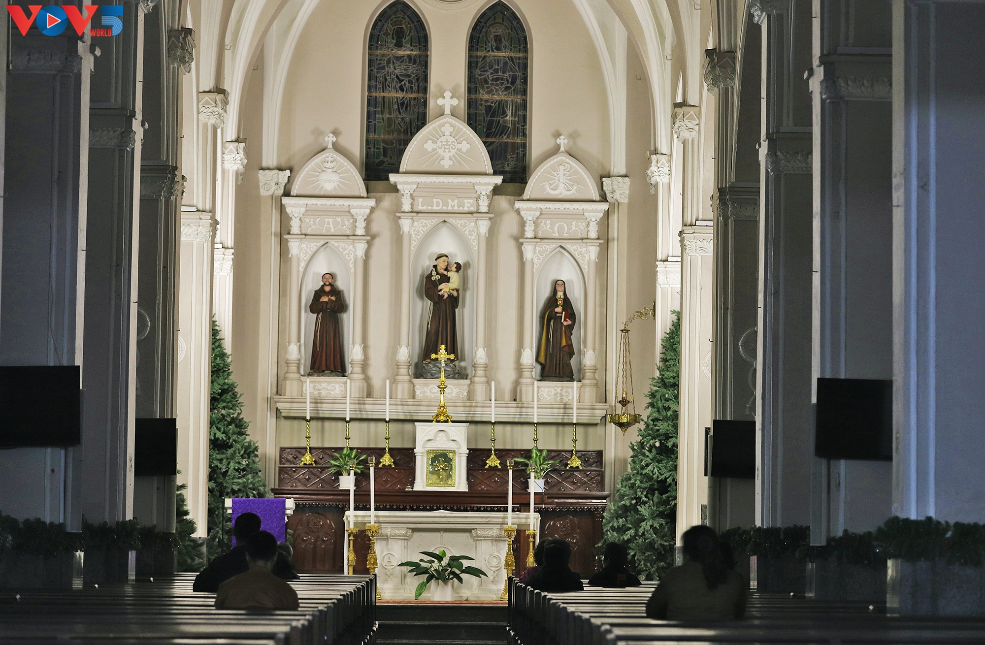 Khoảnh khắc tĩnh lặng bao trùm không gian nhà thờ, đối lập rõ nét với nhịp sống đô thị sôi động bên ngoài. Tại đây, người dân thành kính nguyện cầu một mùa Giáng sinh an lành, hạnh phúc đến với gia đình và những người thân yêu. |
