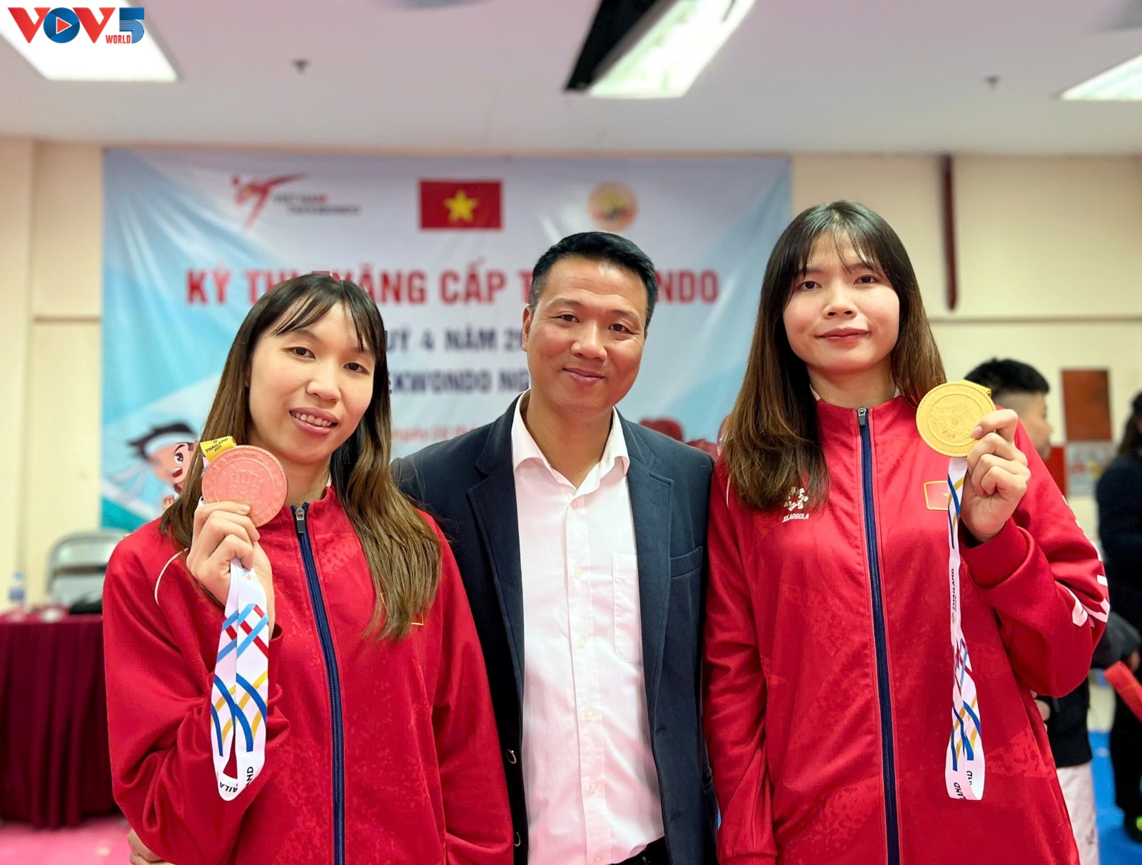 (VOV5) - Kỳ thi thăng cấp tại Câu lạc bộ (CLB) Taekwondo Nghĩa Tân (Hà Nội) vừa qua trở nên đặc biệt hơn bao giờ hết với sự xuất hiện của hai "cô gái vàng" Taekwondo Việt Nam: Bạc Thị Khiêm và Trương Thị Kim Tuyền.