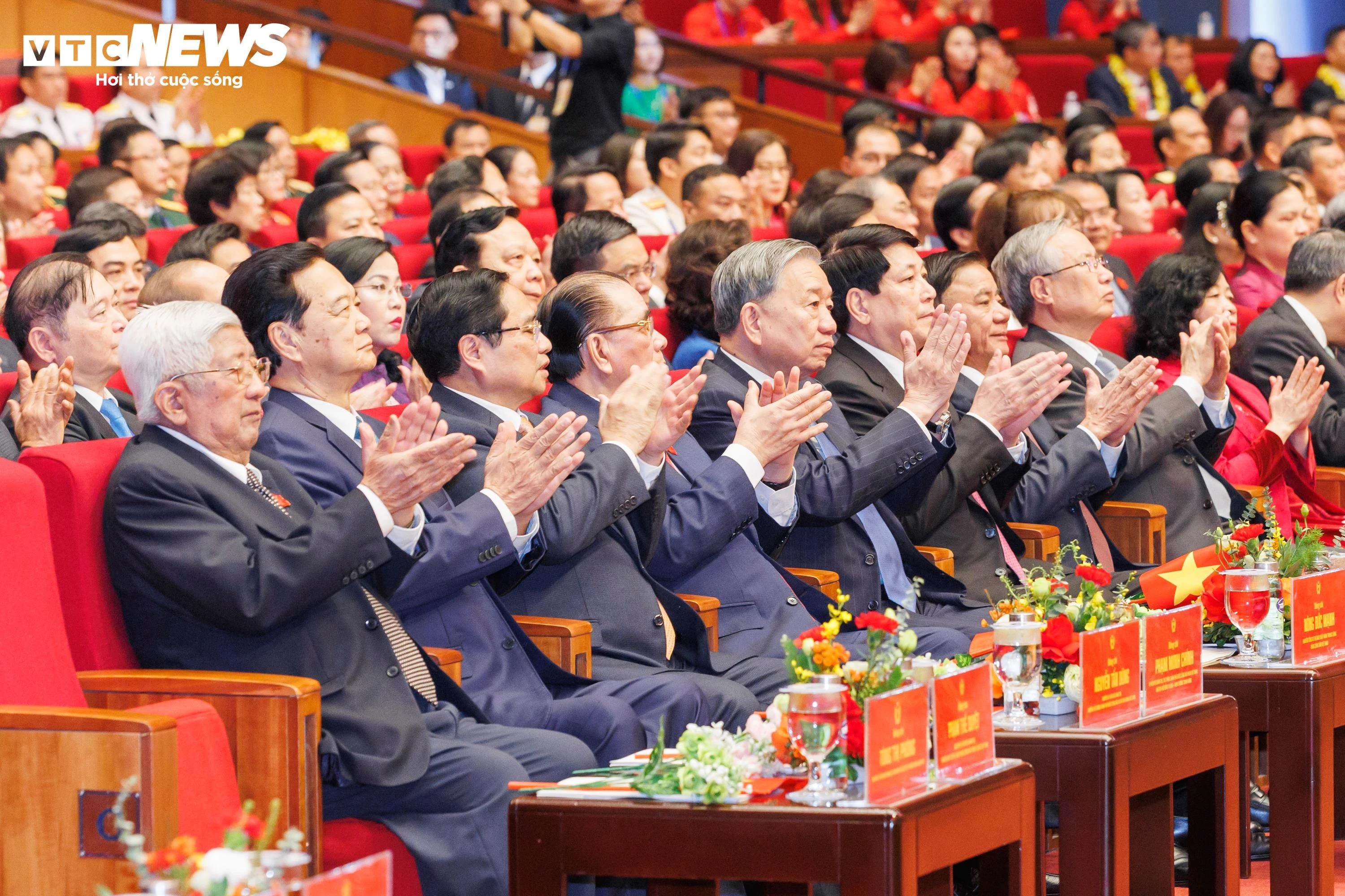 Tổng Bí thư Tô Lâm, Chủ tịch nước Lương Cường, Thủ tướng Phạm Minh Chính và các lãnh đạo, nguyên lãnh đạo Đảng, Nhà nước tham dự đại hội.