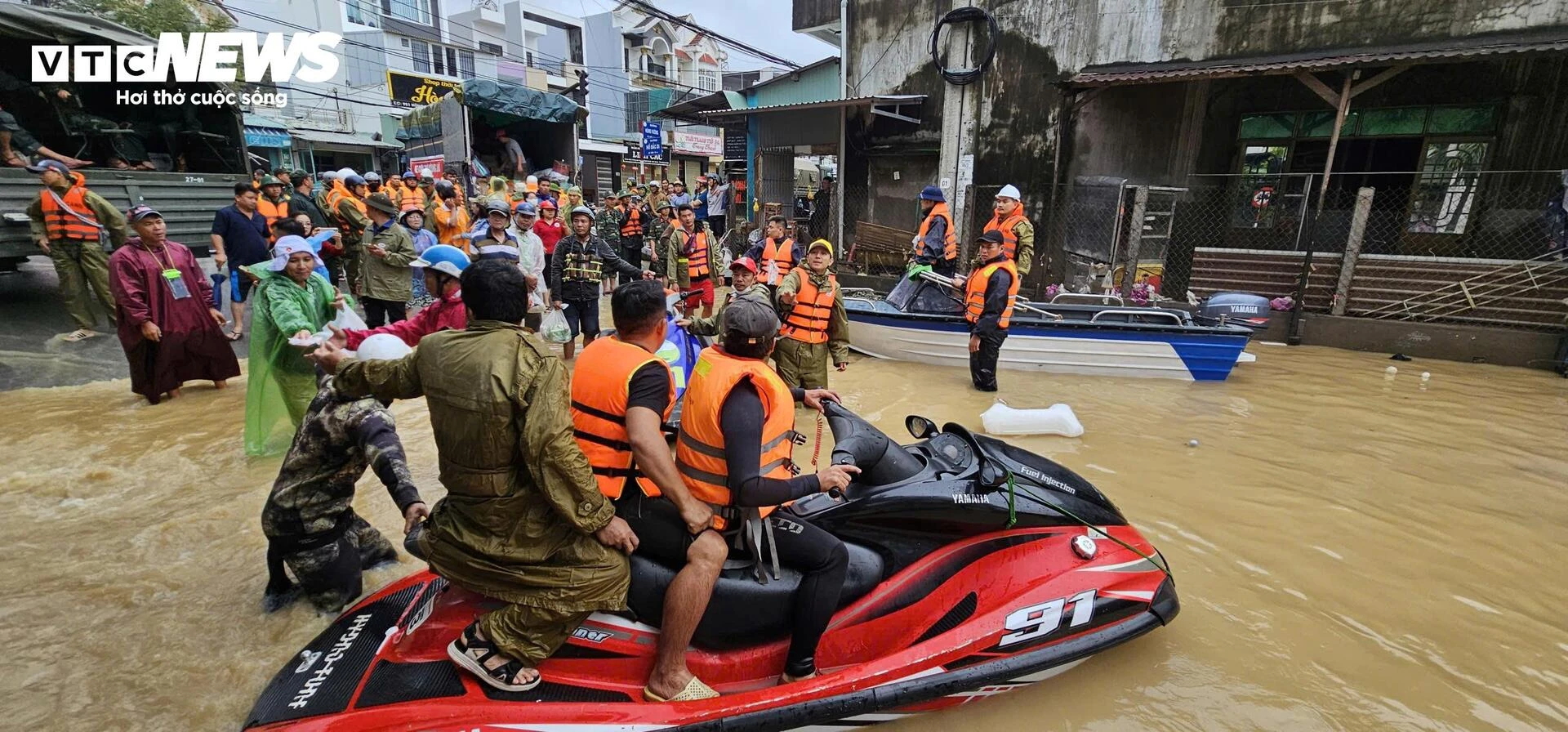 | Công an tăng cường 15 cano, 43 xuồng máy, 400 ô tô, khoảng 4.000 áo phao... đến các khu vực chìm trong nước lũ để hỗ trợ người dân di dời. |