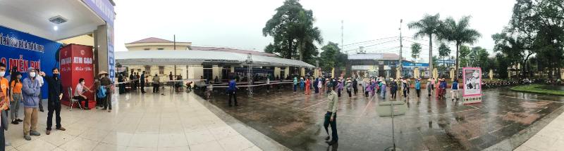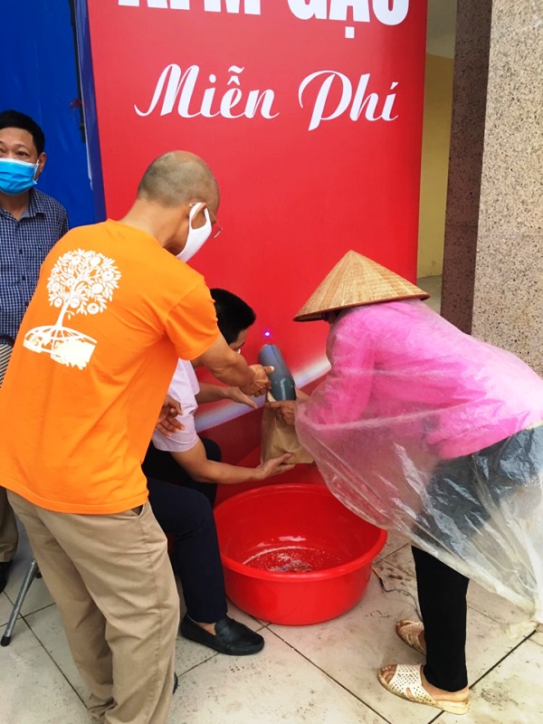 Trời mưa mỗi lúc thêm nặng hạt, thế nhưng dòng người xếp hàng ngày một đông hơn. Bà con đội mưa chờ đến lượt, mỗi người đứng cách nhau 2 mét theo đúng quy định. Bà Mý, người dân tộc Mường ôm bọc gạo trước ngực,bước từng bước chân tập tễnh đi ra phía cổng nhà văn hóa.“Tôi đi từ 6h sáng để đến đây kịp giờ nhận gạo. Cảm ơn đã cho chúng tôi gạo. Từng này gạo là tôi ăn thêm được mấy bữa rồi!” – bà Mý nói.