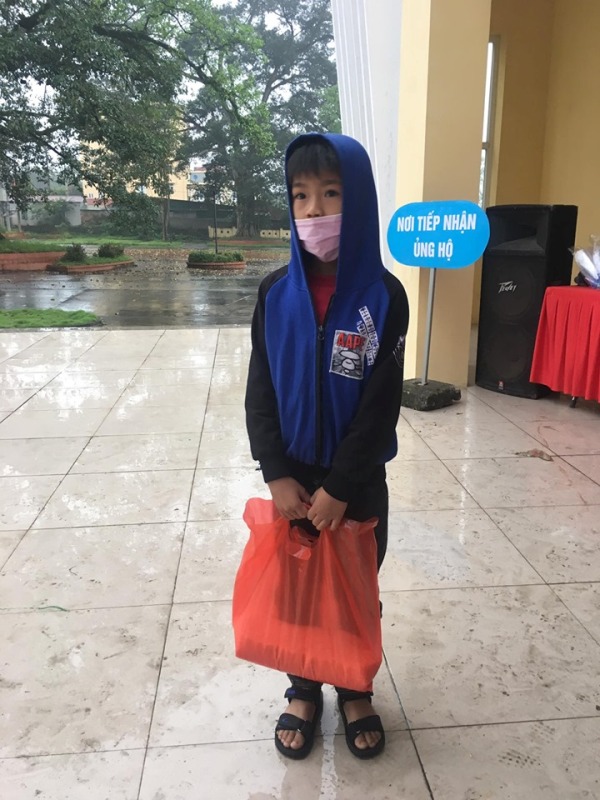 Bé Chính với túi gạo đến quyên góp vào ATM gạo miễn phí |