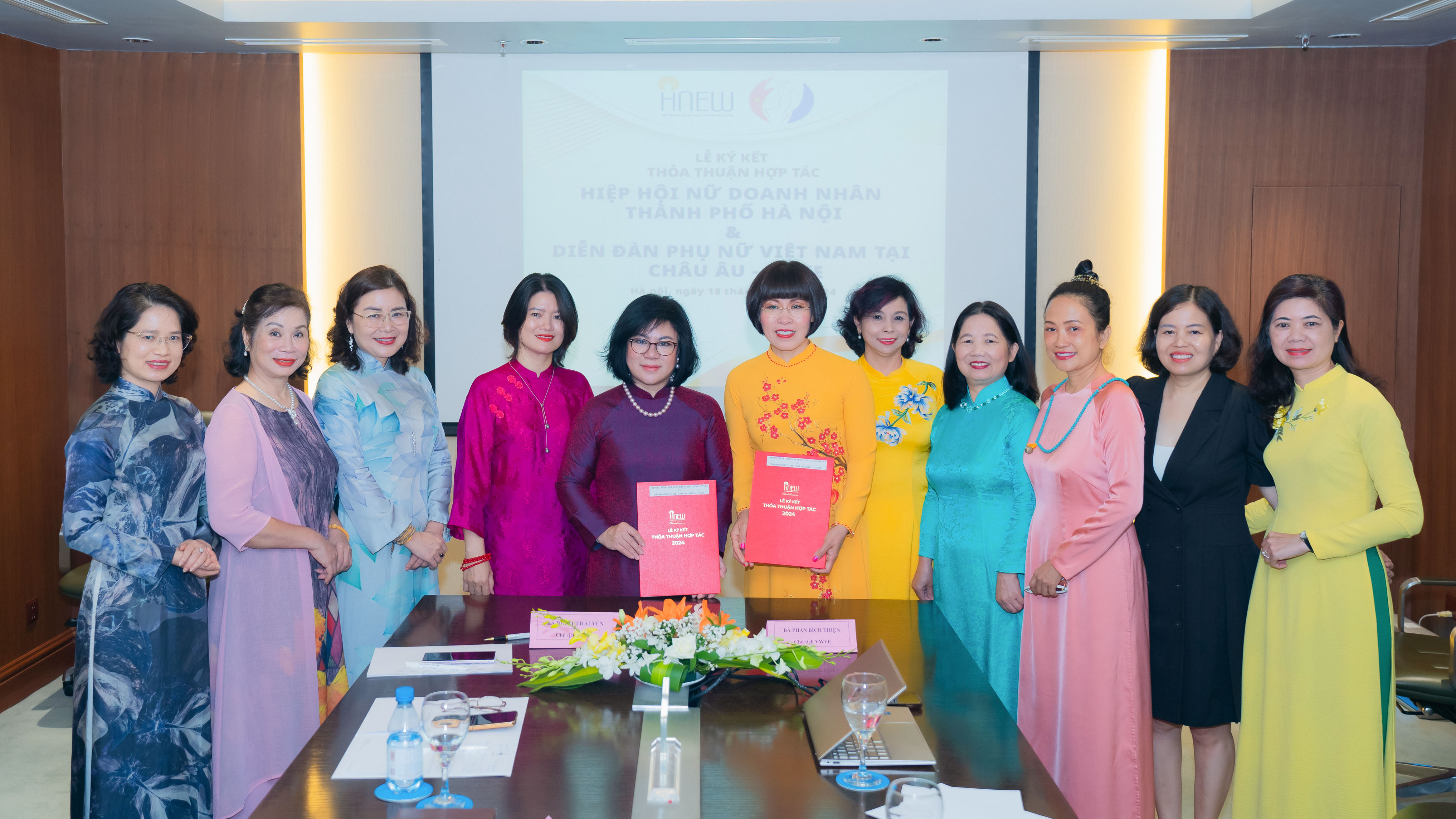 Diễn đàn Phụ nữ Việt Nam tại Châu Âu ký kết hợp tác cùng Hiệp hội nữ doanh nhân Hà Nội.- Ảnh: HNEW |