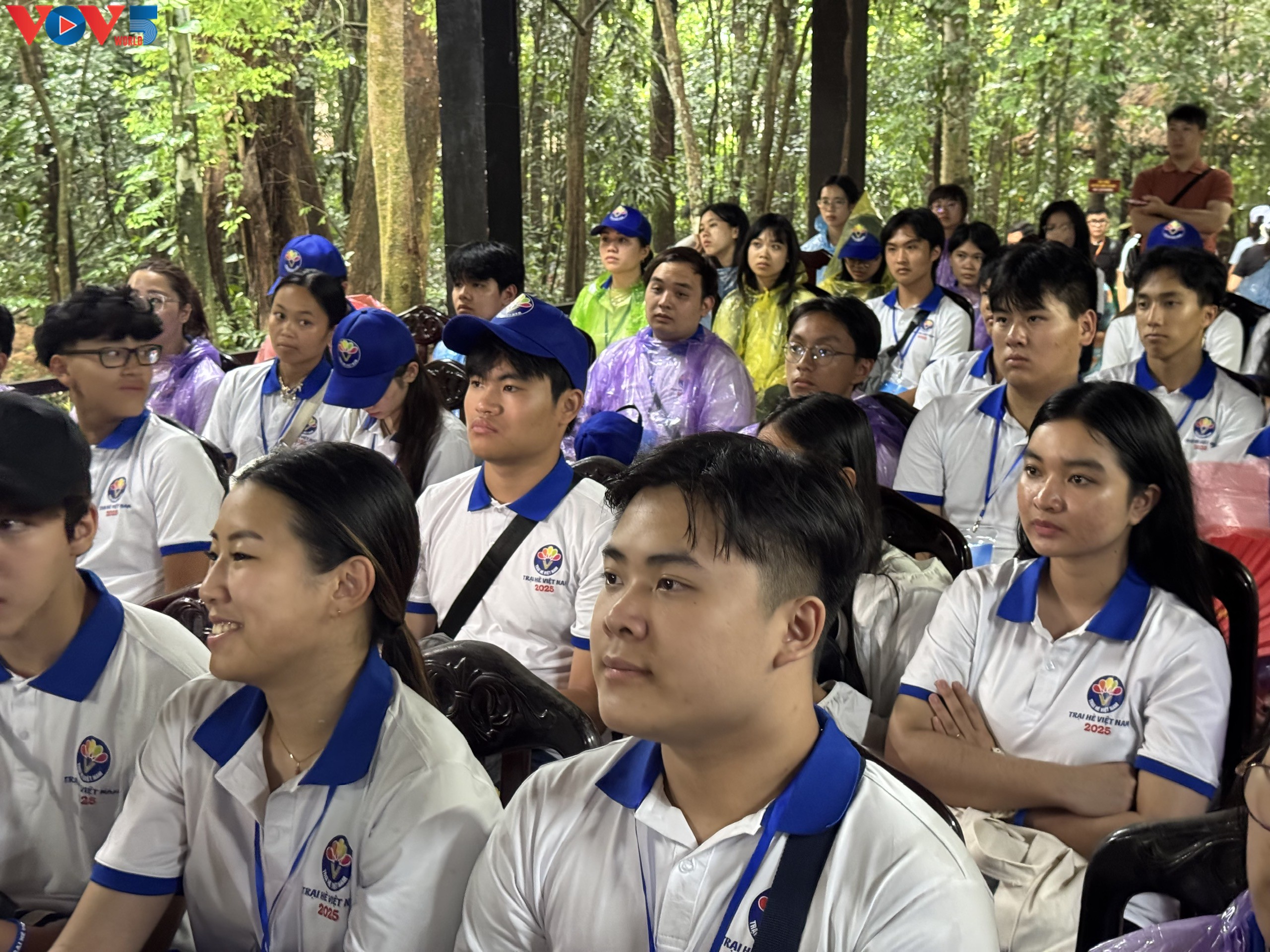 Thanh thiếu niên kiều bào xem phim tư liệu lịch sử giới thiệu về những chiến công anh dũng của quân và dân miền Nam trong kháng chiến chống Mỹ tại địa đạo Củ Chi. Ảnh: Lê Huy |