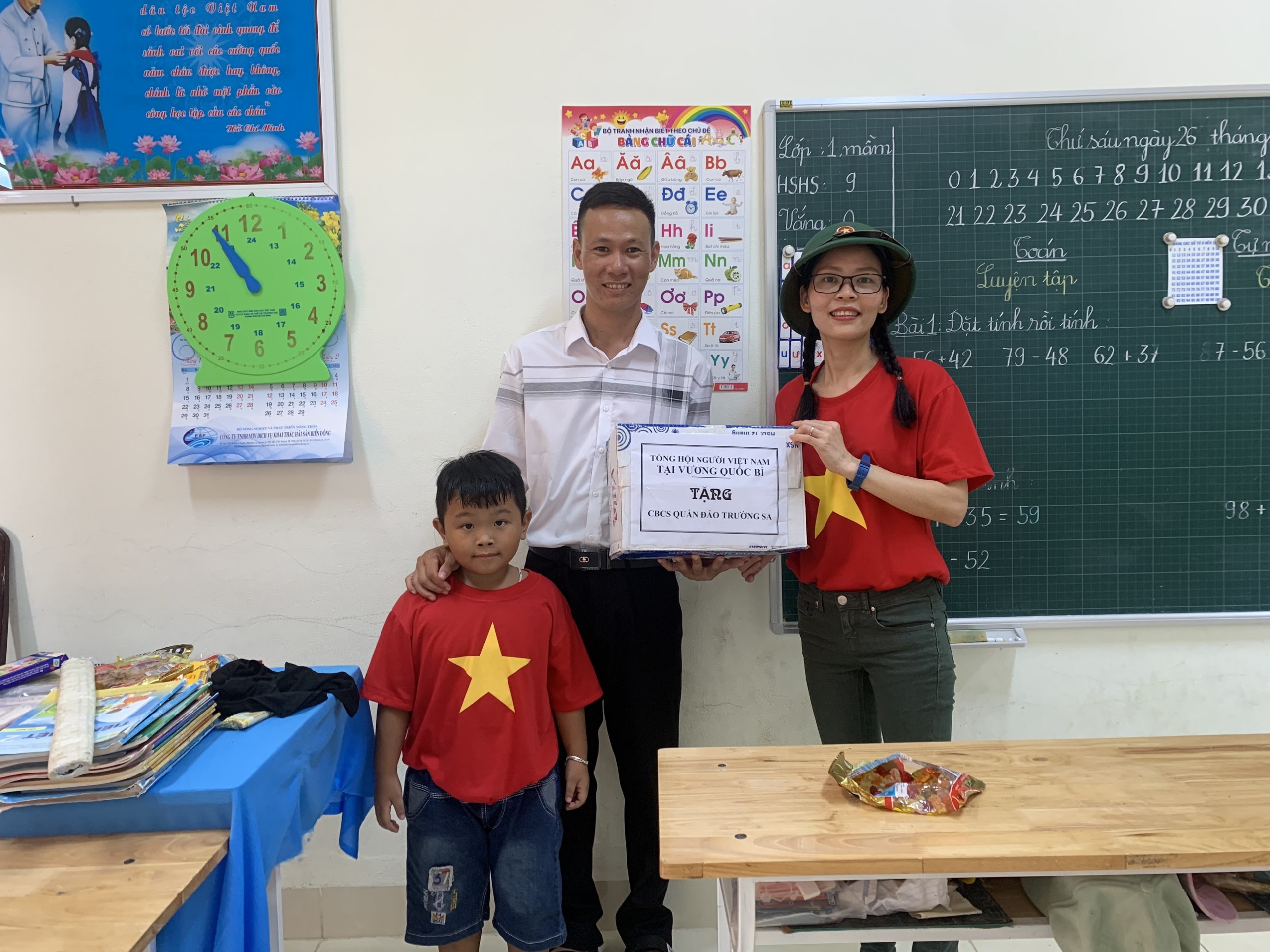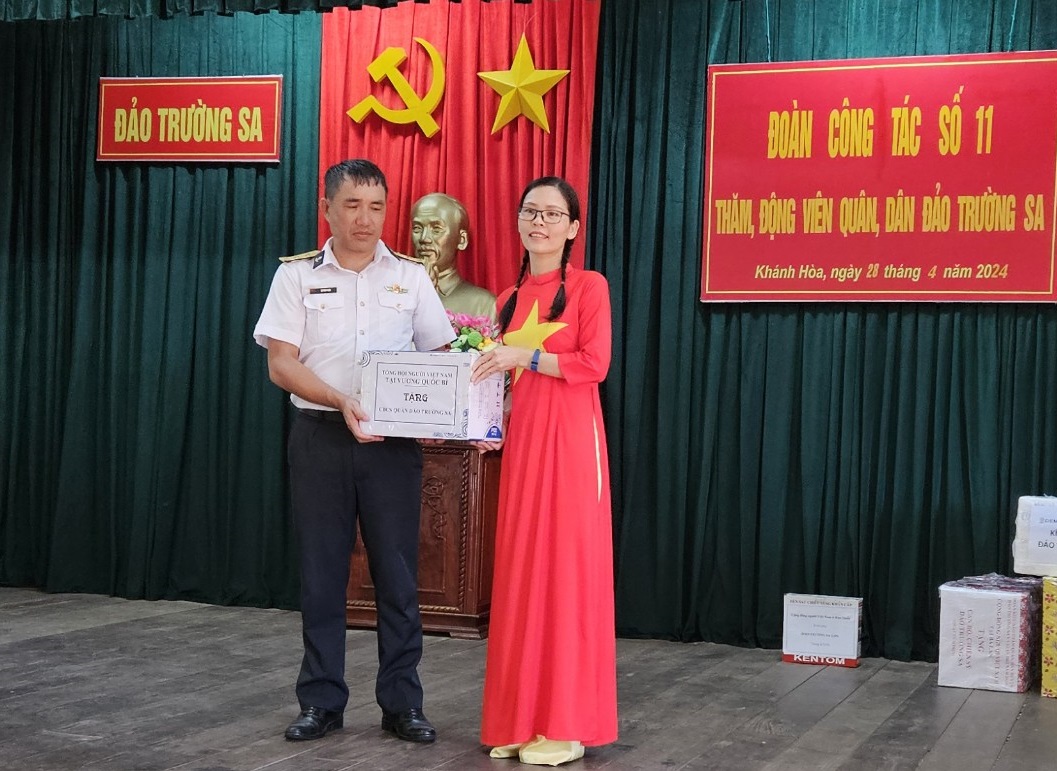 Chị Đào Thị Thu Hằng, đại diện cho Tổng hội người Việt Nam tại Vương quốc Bỉ, tặng quà cho thầy trò đảo Trường Sa. |
