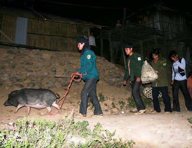 Vào ngày cưới nhà trai mang theo những lễ vật tới nhà gái gồm: Bạc trắng 20 đồng, 200 kg lợn, gà từ 9-11 con, rượu cần 1 chum, gạo nếp 20 kg và nhiều sạp vải… Quan trọng hơn cả trong số các lễ vật nhà trai đưa sang nhà gái là hai bó thịt sóc, hoặc thịt chuột rừng đã sấy khô, với khoảng 30 con sóc, chuột trở lên. Mỗi bó sẽ được buộc lại bằng sợi chỉ đỏ và đen kết hợp lại với nhau. Trong đó sợi chỉ đỏ tượng trưng cho người con trai, và sợi chỉ đen tượng trưng cho người con gái.