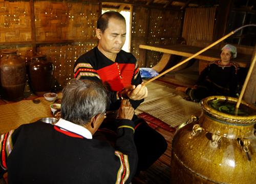 "Bây giờ tôi kêu gọi tất cả mọi người mời các thần linh tổ tiên về chứng giám. Đây là cần rượu đặt nằm trên, chiếc vòng đồng đặt nằm dưới, là chiếc vòng đồng được đúc mà ra, được làm nên mà có, không phải chiếc vòng lạc vòng nhơ. Mong các thần chứng giám, bảo vệ cho gia chủ được bình an, như chiếc vòng đồng cứng không bao giờ bị méo mó. Đây tay gia chủ đã đeo vòng và vít cần rượu, thành kính dâng lên. Thầy cúng cho biết,