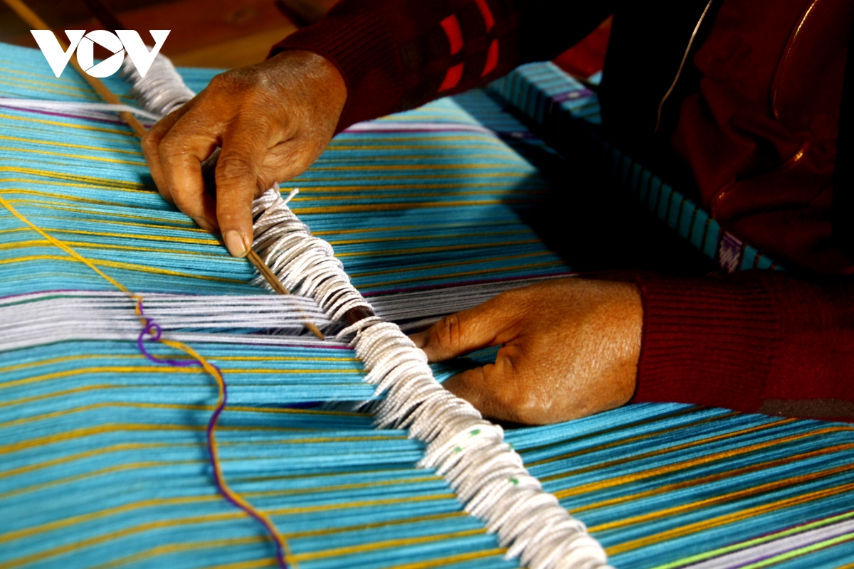 Để tạo hình hoa văn, người dệt sẽ thiết kế bố cục, kích cỡ họa tiết từ khi bắt đầu lên khung, nhặt sợi. Mỗi loại hoa văn có số sợi dọc, sợi ngang, cách nâng và hạ sợi khác nhau, khi dệt sẽ tạo thành các dải họa tiết nối tiếp nhau chạy dài theo chiều dọc khổ vải. Trong quá trình xếp sợi, người dệt sẽ phối màu từ xen kẽ như đỏ - đen, đen - vàng, đỏ - chàm sẫm để khi dệt sẽ có những dải hoa văn nổi bật, tạo điểm nhấn cho trang phục.