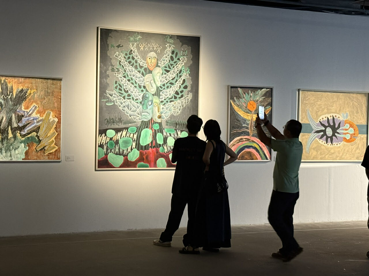 Công chúng thưởng ngoạn các tác phẩm của nghệ sĩ Đào Minh Tri trong triển lãm Hồi cố vọng lai, do Đỗ Tường Linh giám tuyển vào tháng 9/2025 tại Trung tâm Nghệ thuật Đương đại Vincom VCCA - Ảnh: Đỗ Thủy