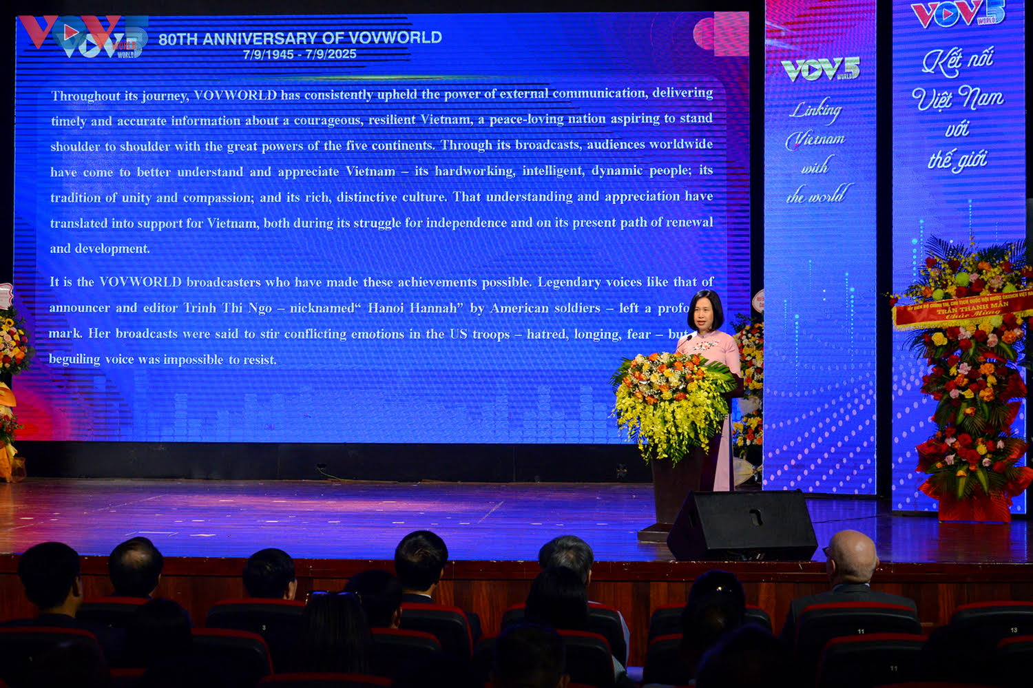 Trong diễn văn khai mạc, bà Phó Cẩm Hoa, Trưởng ban Ban Đối ngoại, điểm lại những nét nổi bật trong hành trình 80 năm hình thành và phát triển của Ban Đối ngoại, đơn vị ra đời cùng ngày với Đài Tiếng nói Việt Nam (07/09/1945). Từ 1 đơn vị với 3 chương trình thời sự phát sóng bằng tiếng Anh, tiếng Pháp, tiếng Quảng Đông (Trung Quốc), đã phát triển thành đơn vị với 13 thứ tiếng. Trên chặng đường ấy, Phát thanh Đối ngoại đã luôn phát huy sức mạnh của truyền thông Đối ngoại, để đưa tin kịp thời và chính xác về một Việt Nam anh dũng kiên cường, một dân tộc Việt Nam yêu chuộng hoà bình, khao khát vươn mình để “sánh vai cùng các cường quốc năm châu”. Qua làn sóng Phát thanh Đối ngoại, các thính giả sinh sống tại nhiều quốc gia, châu lục trên thế giới hiểu Việt Nam hơn, từ đó mà yêu hơn đất nước hình chữ S, yêu hơn dân tộc cần cù chịu khó, thông minh, năng động với truyền thống tương thân tương ái, yêu hơn nền văn hoá Việt Nam đậm đà bản sắc để rồi từ đó ủng hộ Việt Nam trong công cuộc đấu tranh giành độc lập trước đây cũng như trong công cuộc đổi mới, kiến thiết đất nước ngày nay.