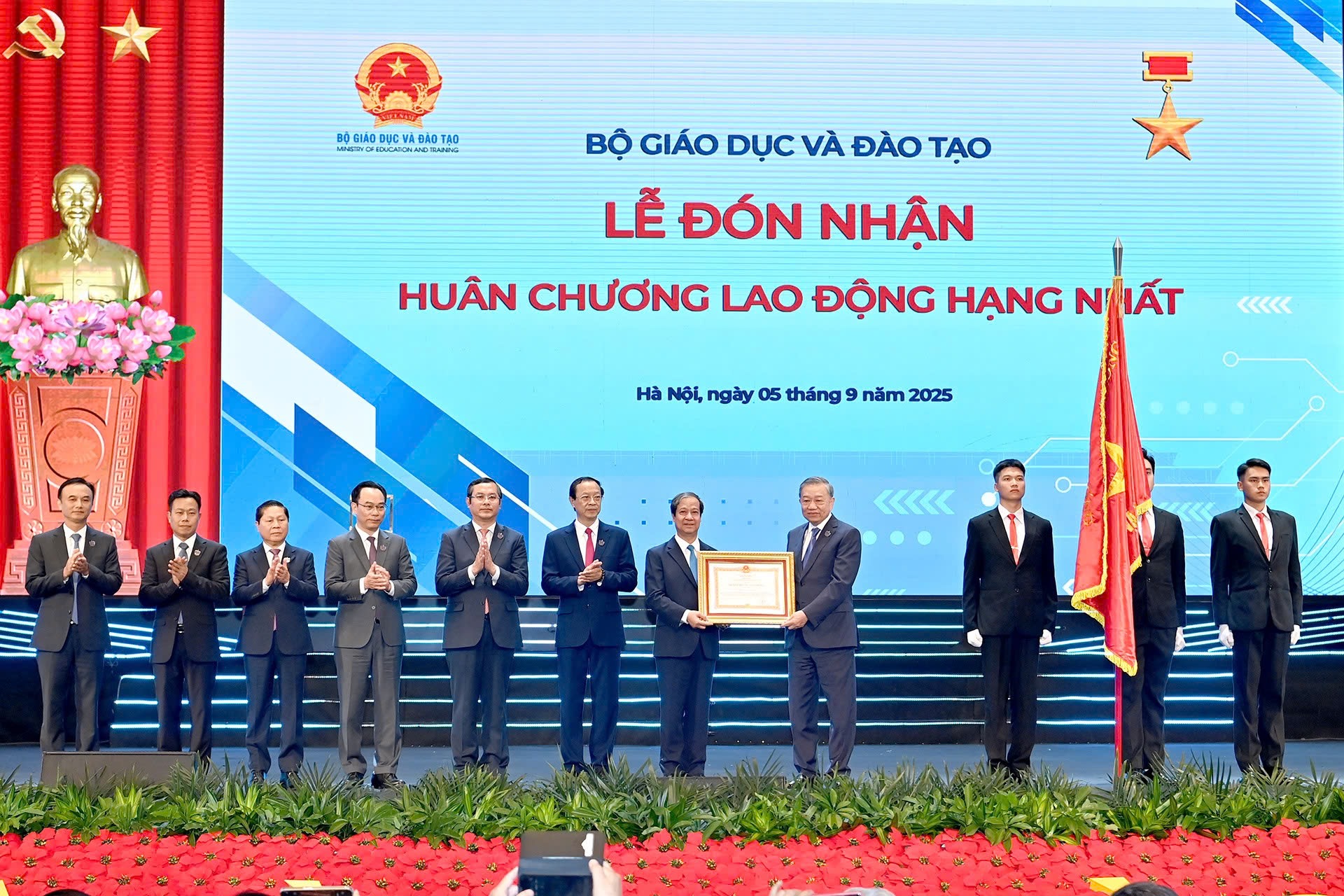 Tổng Bí thư Tô Lâm trao tặng Huân chương lao động hạng Nhất cho Bộ Giáo dục-Đào tạo. Ảnh: VOV |