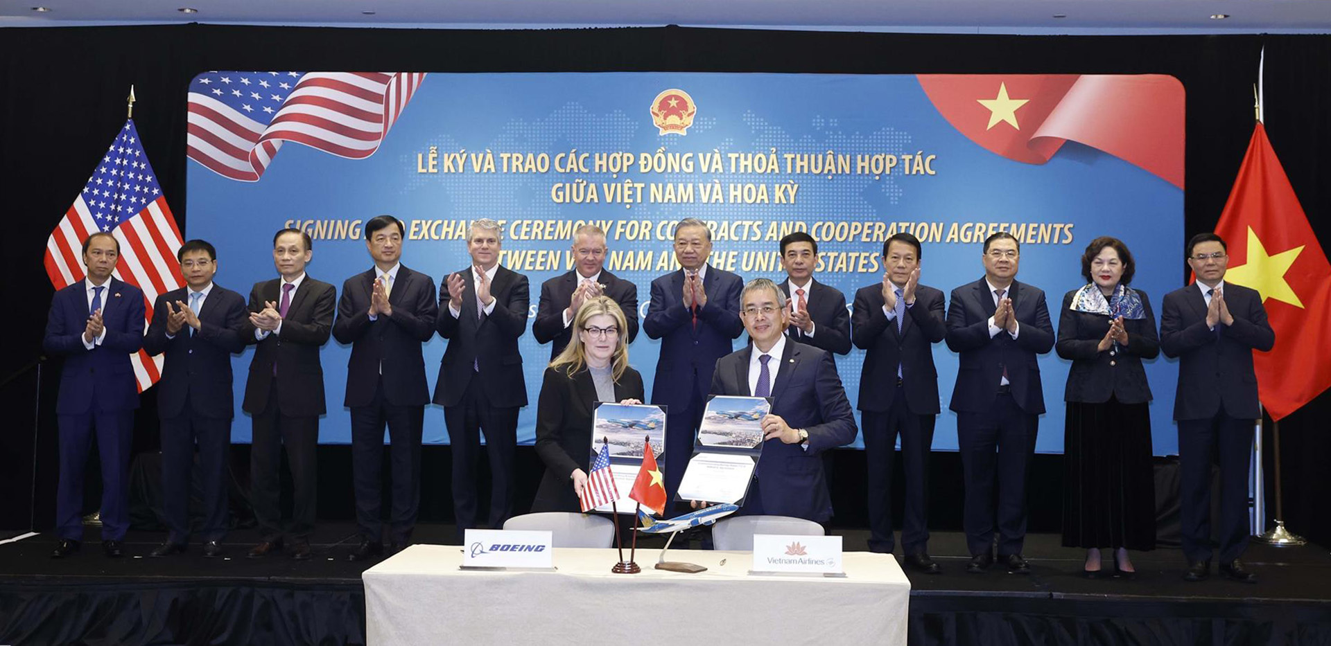 Tổng Bí thư Tô Lâm chứng kiến lễ ký Hợp đồng mua 50 máy bay Boeing 737 MAX giữa Tổng công ty hàng không Việt Nam (Vietnam Airlines) và Tập đoàn Boeing. Ảnh: Thống Nhất/TTXVN