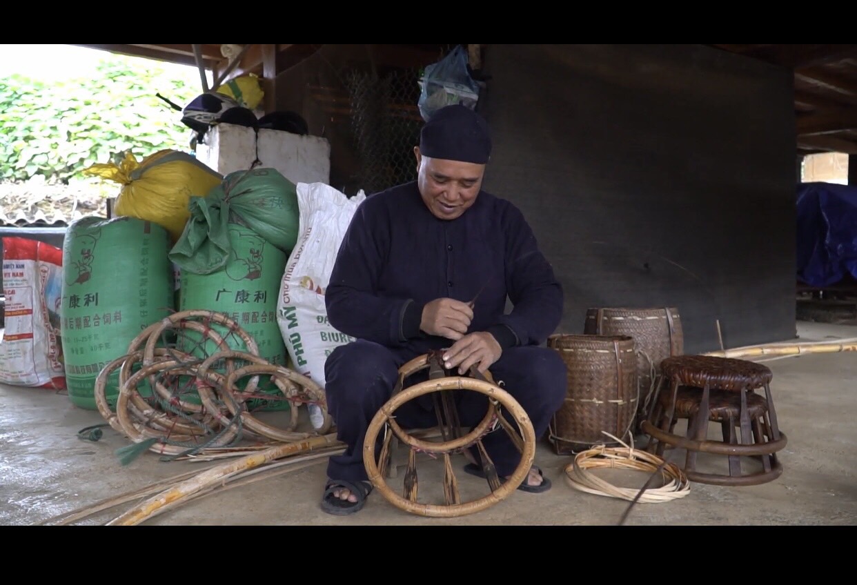 Nghệ nhân Vì Văn Chữ chia sẻ: "Để làm chiếc ghế mây, mình đi vào rừng, lấy cây mây về làm lạt, lấy 1 nửa dây mây, dây ngọn, làm lạt để đan, một nửa dưới chia đôi làm vòng tròn của ghế. Một vòng to và 1 vòng nhỏ, lạt thì cần phải phơi khô rồi đun, nó dẻo thì mình mới đan được. Vòng khi nào khô thì mình đo, song mình cắt. Sau đó cho trống vào giữa, trống phải là tre già để đảm bảo chắc chắn. Sau đó mình đan là hoàn chỉnh luôn."