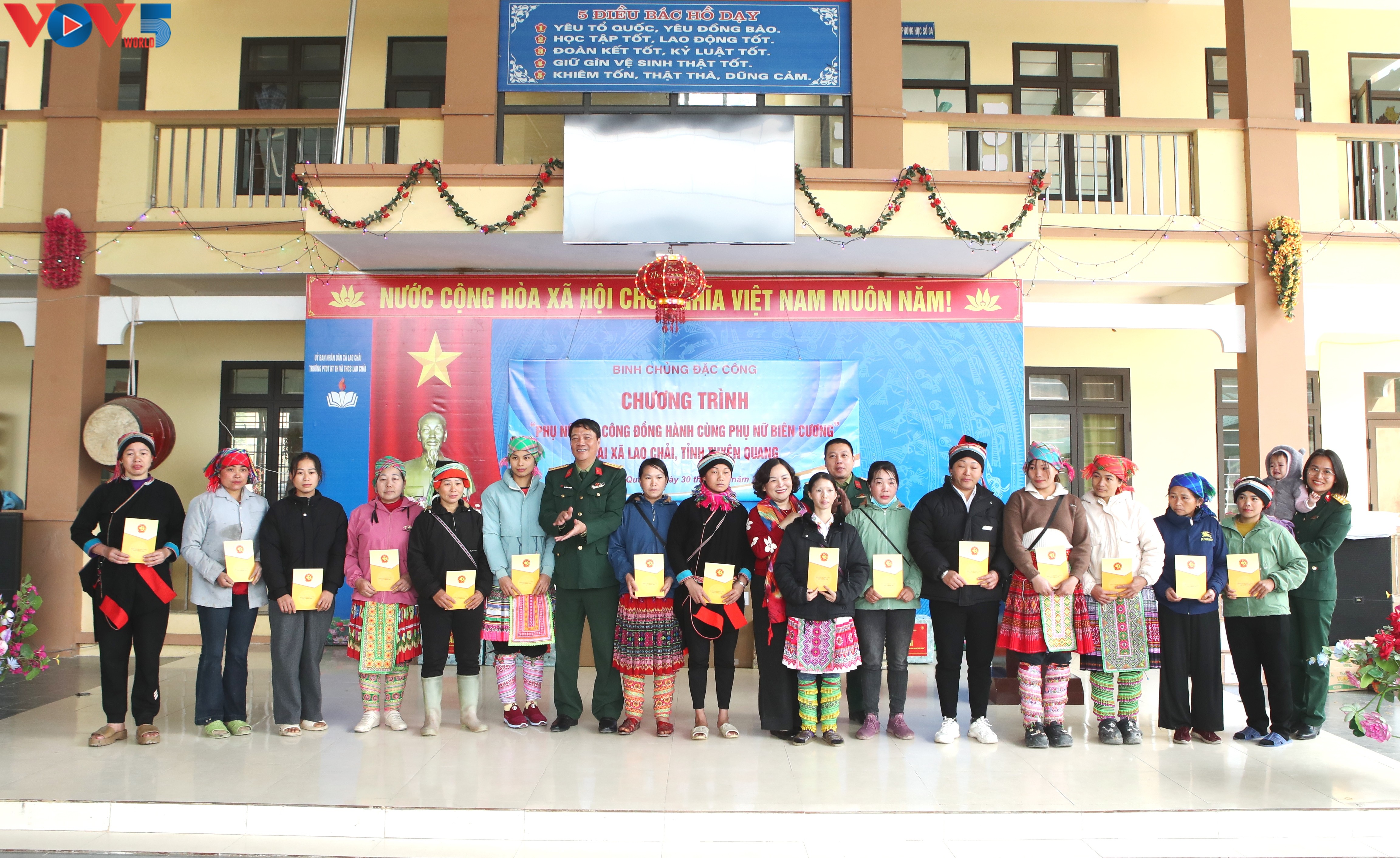 Tiếp đó, tại Trường Phổ thông dân tộc bán trú Tiểu học và THCS Lao Chải, thuộc xã Lao Chải, Binh chủng Đặc công phối hợp với cấp ủy, chính quyền địa phương tổ chức hoạt động trao quà cho nhà trường, phụ nữ và nhân dân có hoàn cảnh khó khăn trên địa bàn. Các phần quà tặng gồm: tivi cho nhà trường; vở và đồ dùng học tập, áo ấm, bánh, kẹo cho các em học sinh; áo dài, áo dạ cho phụ nữ còn nhiều thiếu thốn; trao quà cho 15 hộ gia đình có hoàn cảnh khó khăn tại xã Lao Chải.