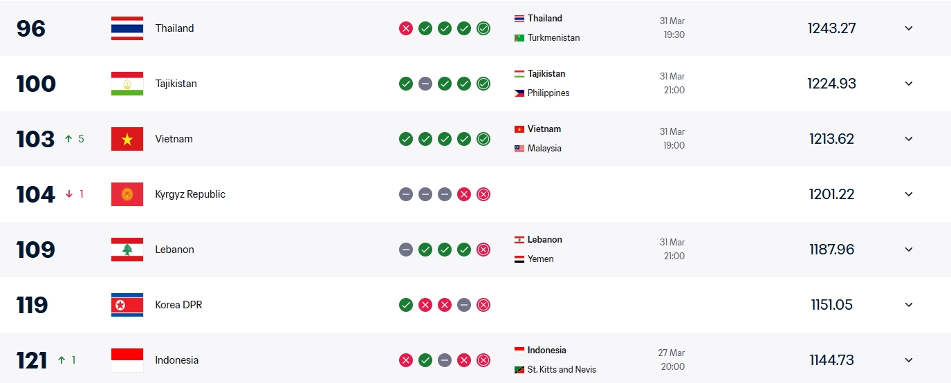 Khoảng cách giữa Việt Nam và Top 100 hiện còn hơn 10 điểm. Nếu thắng Bangladesh trong trận giao hữu tối 26/3, và hạ Malaysia ở lượt cuối vòng loại Asian Cup tối 31/3, Đội tuyển Việt Nam có cơ hội lớn vào Top 100.