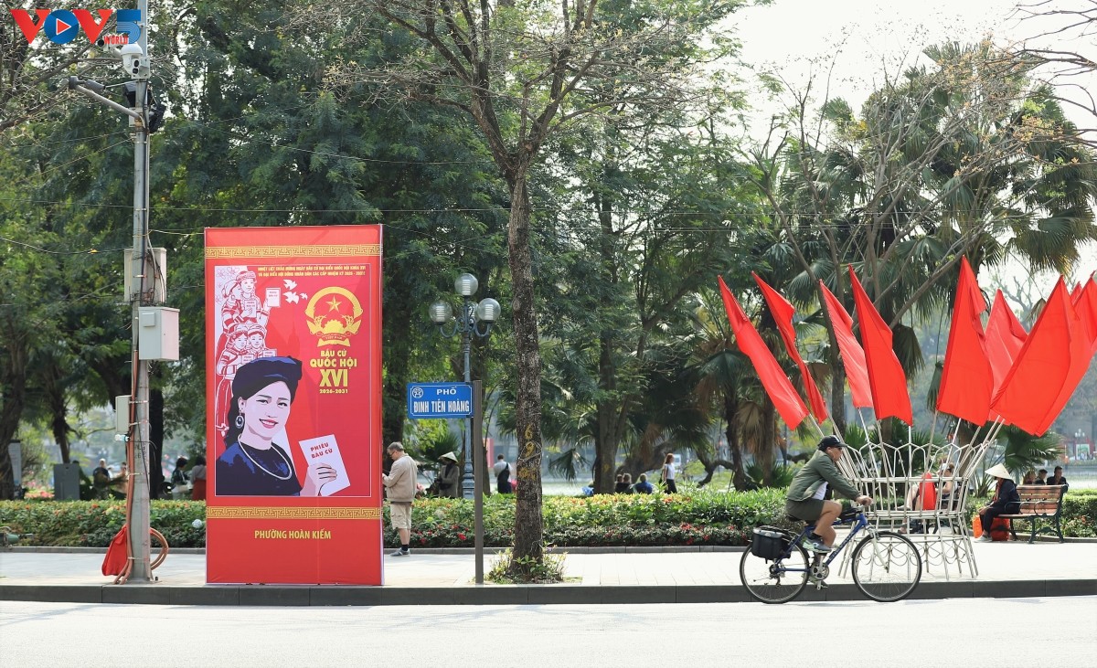 Những ngày tháng 3, các tuyến phố của Thủ đô Hà Nội rực rỡ sắc đỏ của cờ Tổ quốc, cờ Đảng, băng rôn, pano, áp phích chào mừng cuộc bầu cử đại biểu Quốc hội khóa XVI và đại biểu Hội đồng nhân dân các cấp nhiệm kỳ 2026 – 2031.