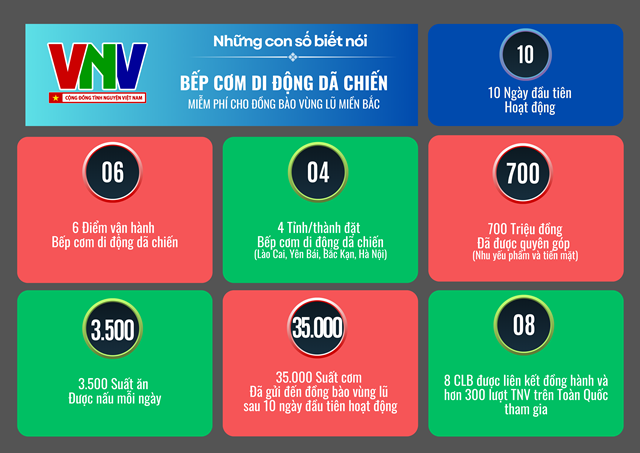 Hệ thống Bếp Cơm Di Động Dã Chiến do Cộng đồng Tình nguyện Việt Nam vận hành đã trở thành một điểm tựa vững chắc cho đồng bào vùng lũ miền Bắc. Chỉ trong 11 ngày đầu tiên hoạt động( kể từ ngày 17-9 đến nay), hệ thống bếp đã cung cấp 35.000 suất cơm miễn phí cho hàng ngàn người dân đang đối mặt với khó khăn do thiên tai. Hiện tại, hệ thống bếp đã có mặt tại 4 tỉnh/thành chịu ảnh hưởng nặng nề của bão lũ, gồm: Lào Cai, Bắc Kạn, Yên Bái, và Hà Nội. Đặc biệt, 6 điểm vận hành đã được thiết lập tại các tỉnh này với 1 bếp ở Lào Cai, 3 bếp ở Bắc Kạn, 1 bếp tại Yên Bái và 1 bếp tại Hà Nội. Mỗi ngày, hệ thống bếp cung cấp 3.500 suất cơm cho người dân và các lực lượng cứu hộ làm việc tại hiện trường, giúp họ có thêm sức lực và nghị lực để vượt qua những ngày gian khó.