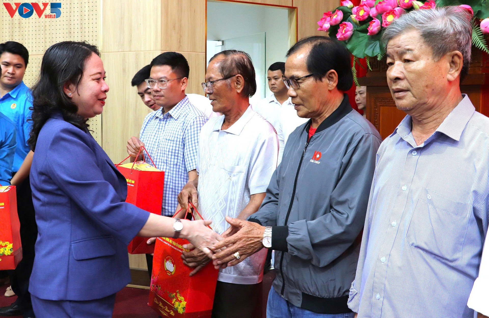 Chủ tịch nước Võ Thị Ánh Xuân và đoàn công tác đã trao tặng 600 phần quà cho các gia đình chính sách, hộ nghèo, công nhân lao động có hoàn cảnh khó khăn tại An Giang. Ảnh: Lam Hiếu/VOV-ĐBSCL |
