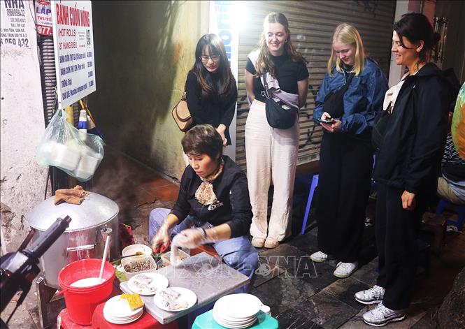 Du khách xem làm bánh cuốn nóng trên phố Hàng Điếu. Ảnh: Vũ Thanh/TTXVN |