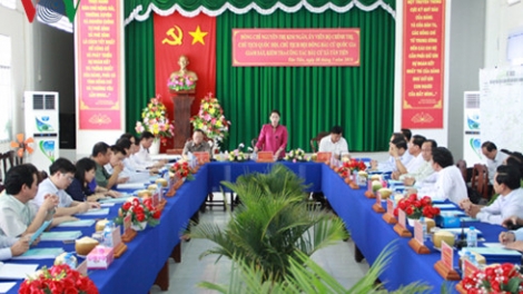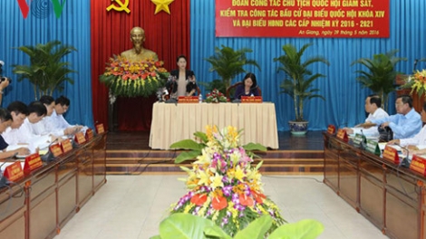 (VOVworld)- 越南国会主席、国家选举委员会主席阮氏金银同国家选举委员会监督团5月8日与坚江省和周城县选举委员会就第14届国会和2016至2021年各级人民议会代表选举准备工作举行座谈。