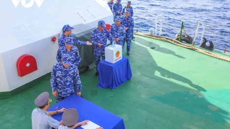 (VOVWORLD) - 对于在海上执行任务的海警战士和渔检力量来说,第十六届国会代表和2026-2031年任期各级人民议会代表选举投票是在浩瀚的海上进行的。