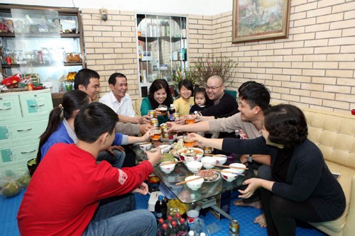 对画家丁进海来说,传统春节特别是年三十充分体现了越南人的优良风俗习惯和传统性格。丁进海说:“河内人不在外面过年,而是与家人一起过年。因此,春节期间,远离家乡的人都努力安排好工作回家团圆。春节来了,家里却有人在外,全家人肯定很担心。因为河内人的年夜饭是十分神圣的。除了快快乐乐地聊天和吃饭,大家还互相见面、探望、慰问,在家庭关爱和温馨的气氛中欢度新年。”