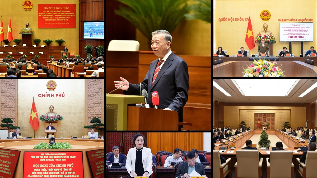 越共中央总书记苏林指出,精简组织机构是特别重要的任务,更是一场革命,必须以最高的决心来完成。图片来源:VOV、VTC、政府新闻网、国会新闻网、《青年报》。