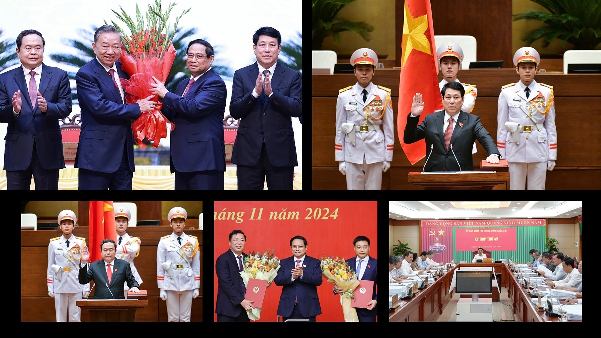2024年,党和国家高层领导班子建设工作以高度团结精神展开,面向实现提高国家领导和管理工作有效性,确保国家稳定发展的目标。越共第十三届中央委员会会议以绝对多数票选举中央政治局委员、国家主席苏林同志为越共中央总书记。越南第十五届国会选举陈青敏同志为国会主席,梁强同志为国家主席。与此同时,国会也通过了国会、政府和司法机构一些领导职务的任命。