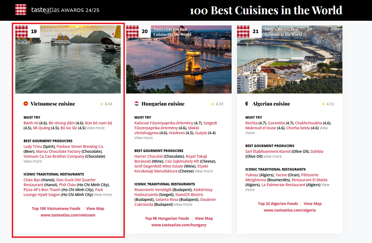 据此,越南以4.34的评分(满分5分)排名第19位,较2023年提升3位。《Taste Atlas》推荐的越南美食有河粉、夹肉面包、醋牛肉火锅、南部牛肉米线、广南面等等。